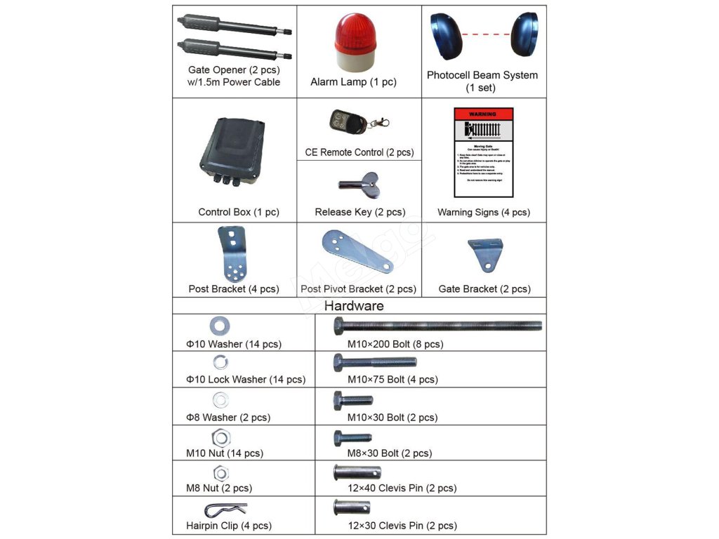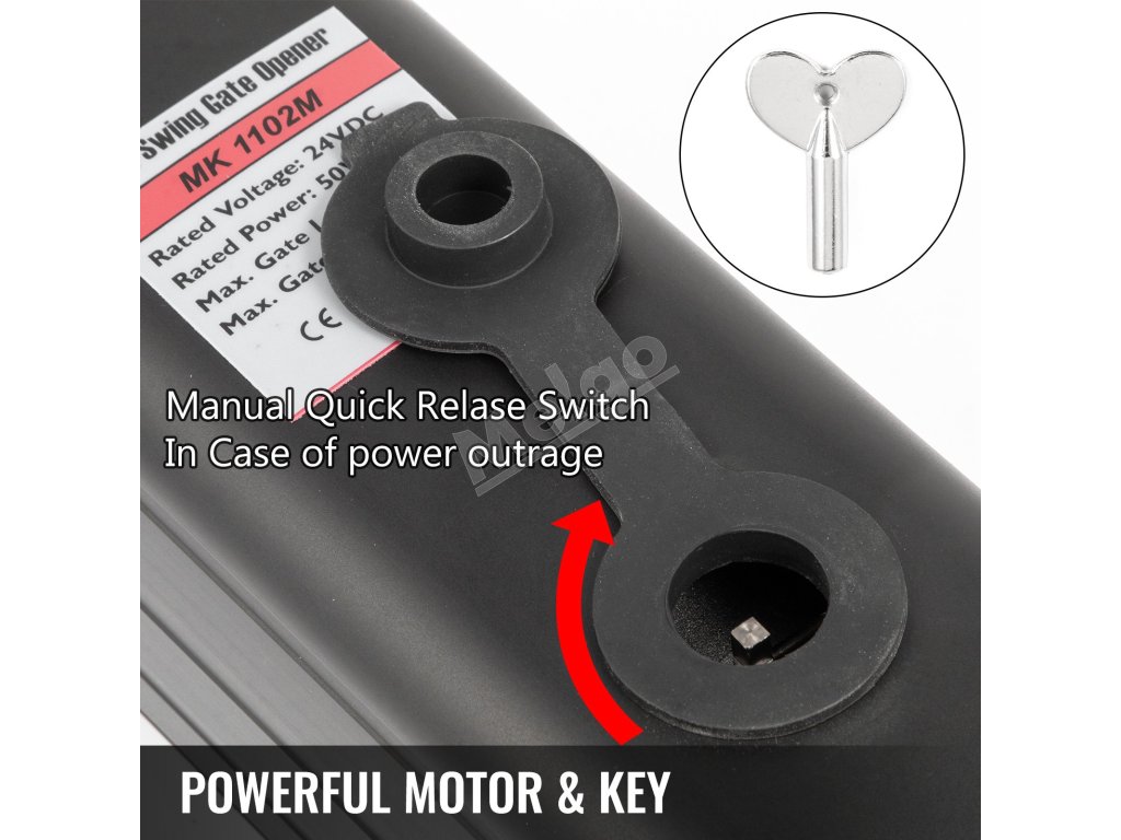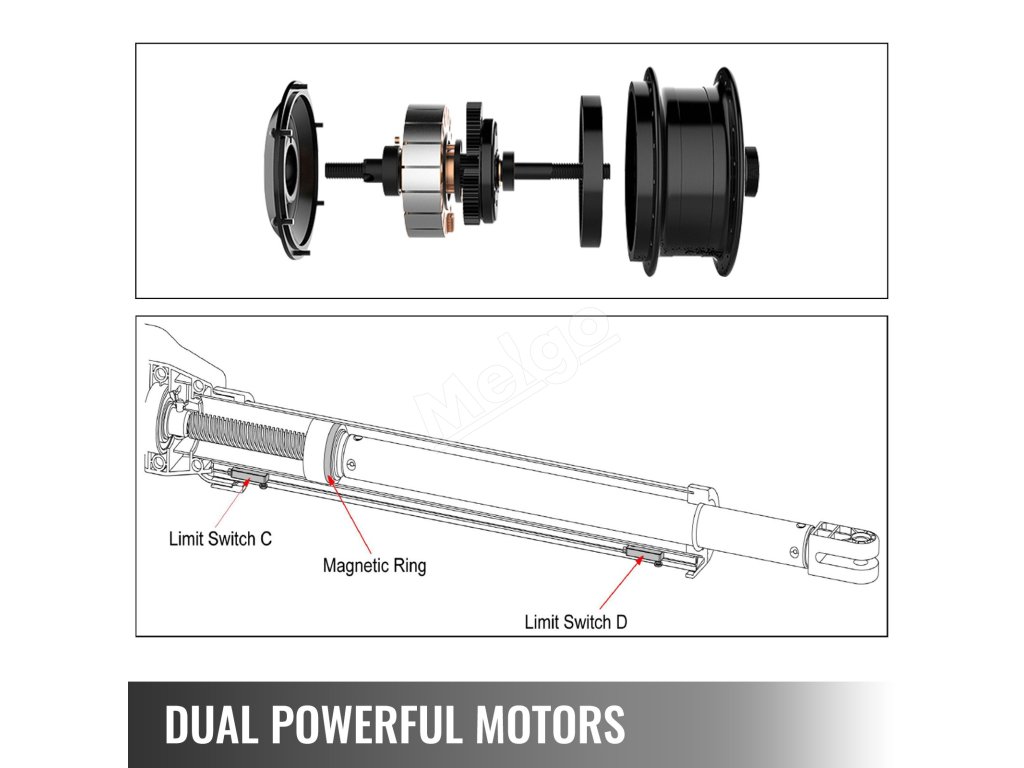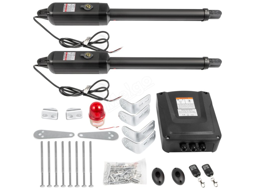 Táto súprava na otváranie brán sa dodáva s dvoma výkonnými 50W motormi (integrovanými do lineárnych pohonov). Koncové spínače je možné nastaviť podľa pokynov v návode.