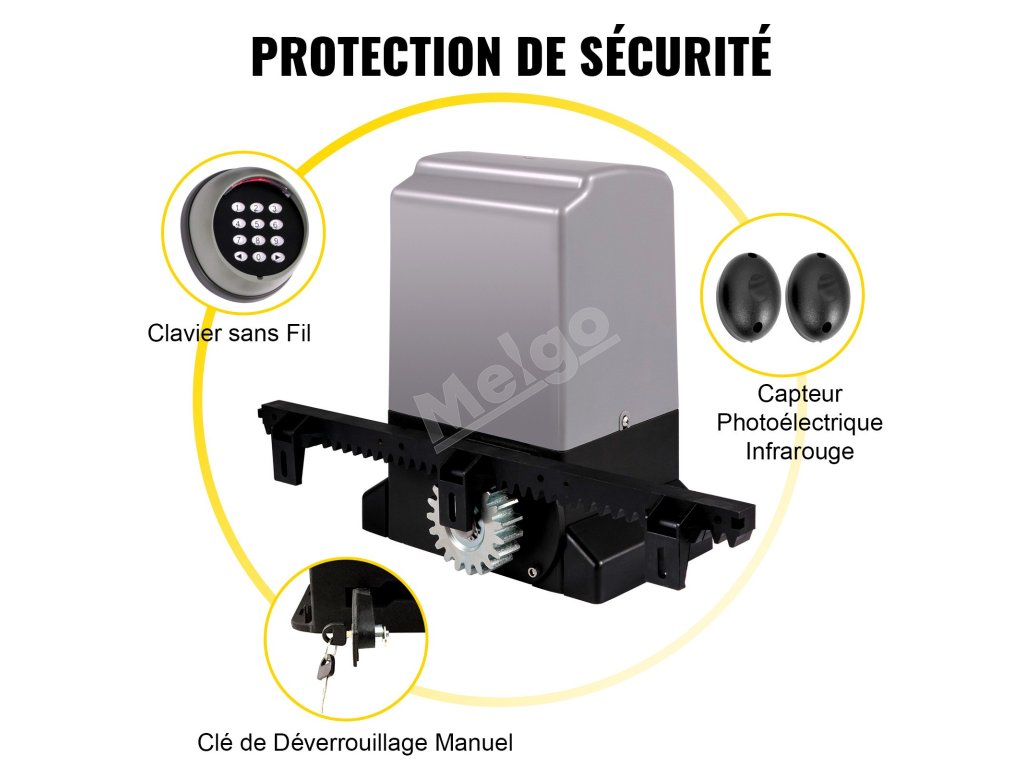 Pohon posuvnej brány má bezdrôtovú klávesnicu, infračervený snímač a tlačidlá na ručné uvoľnenie, ktoré zabezpečujú bezpečnostnú ochranu. Motor má teplotnú ochranu, ktorá zabraňuje preťaženiu motora.