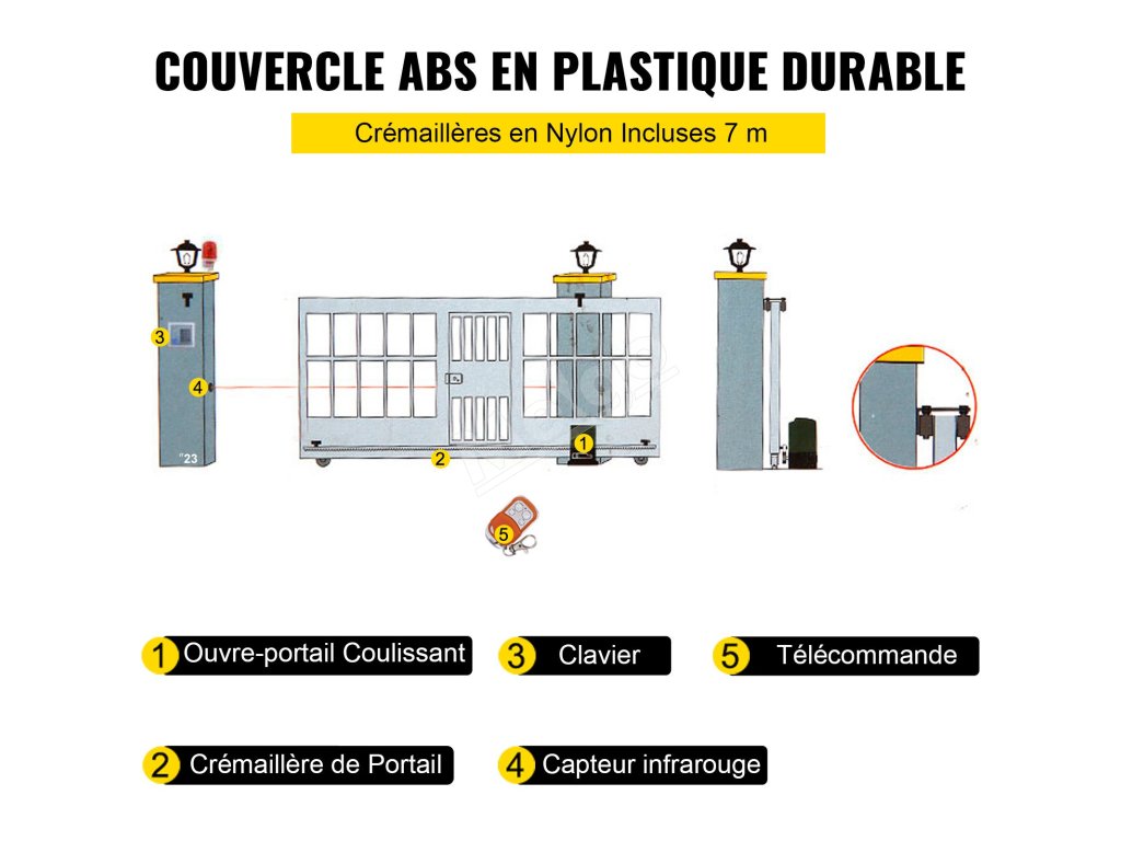 Táto súprava posuvnej plotovej brány je vyrobená z vysokokvalitného materiálu ABS a nylonových ozubených kolies s dĺžkou 23 stôp/7 m. Max. Dĺžka brány: 39 ft/12 m. Odolný plášť je odolný voči poveternostným vplyvom pre dlhé časy.