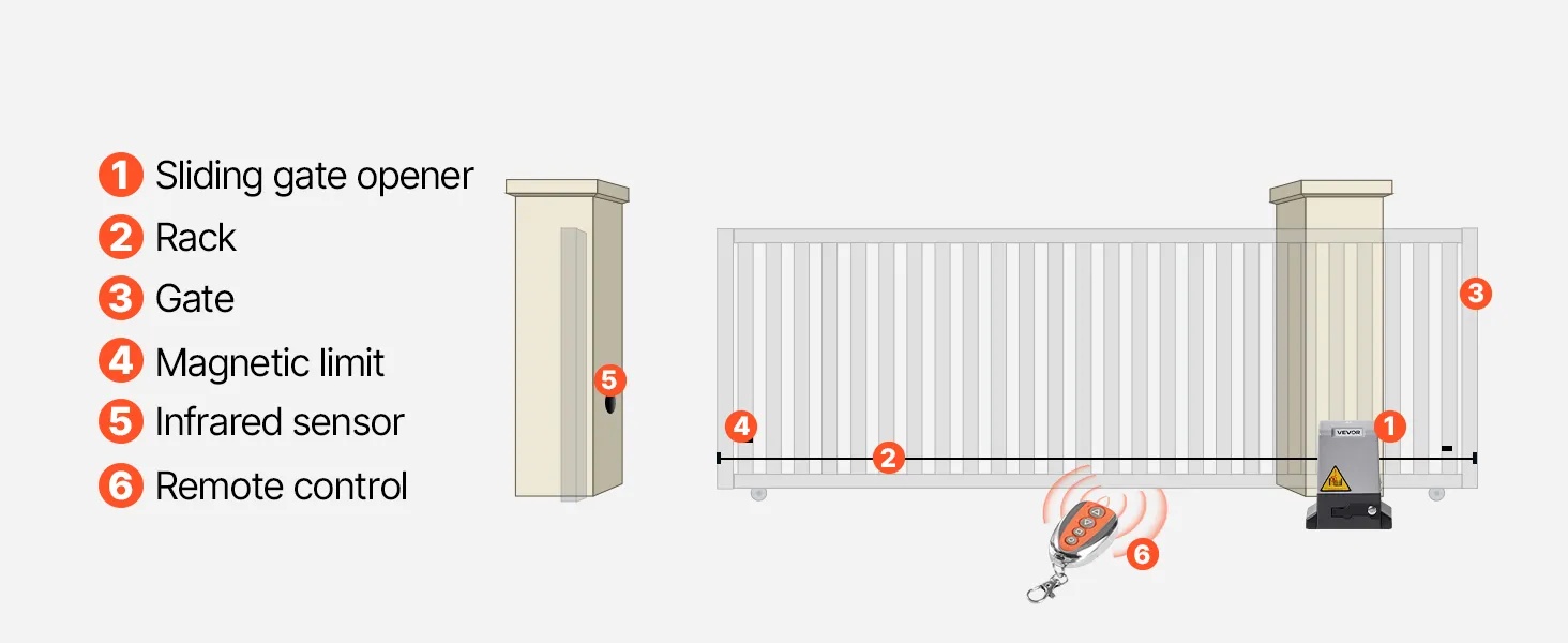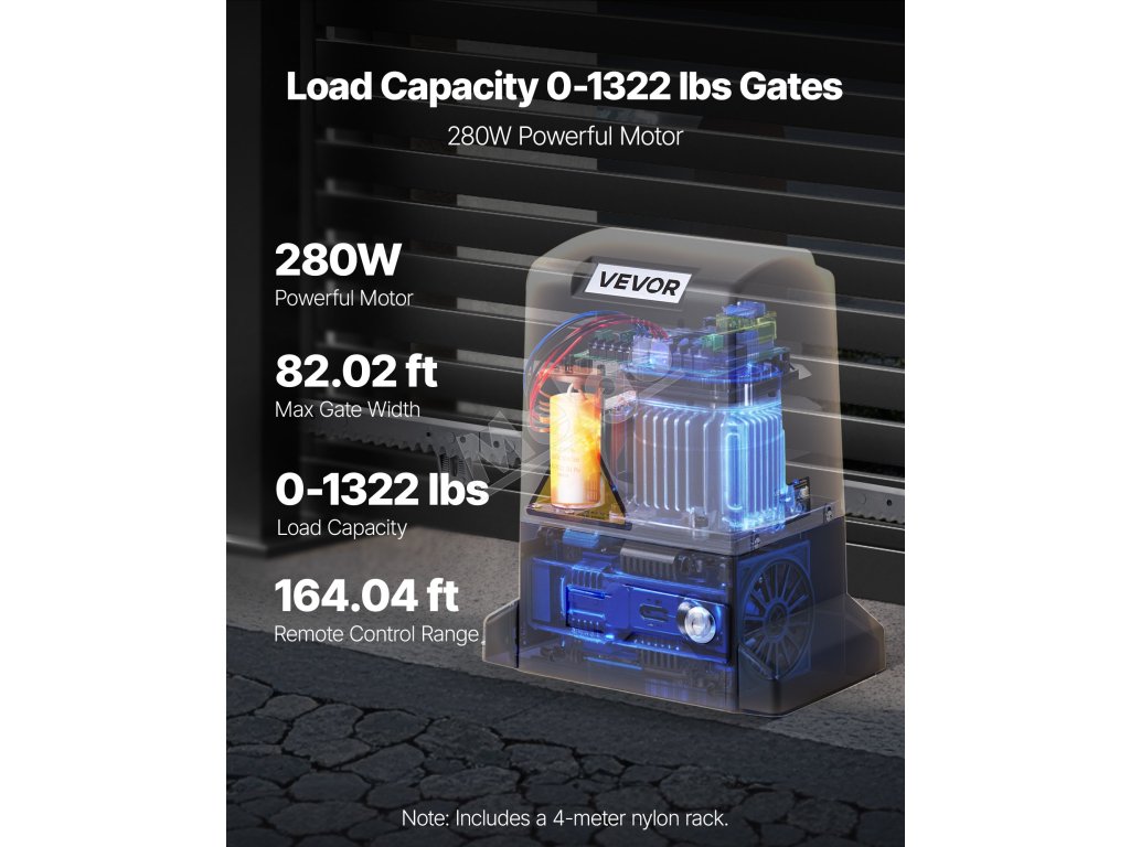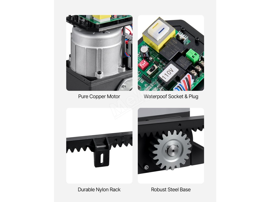 Tento otvárač brán je vybavený 280W motorom z čistej medi, ktorý si poradí s bránami širokými až 82,02 ft / 25 m a s hmotnosťou 1799 lbs / 816 kg, pričom ponúka plynulú a rýchlu prevádzku (10 m/min), ktorá šetrí váš čas. Vďaka infračervenej technológii automatického snímania zabraňuje kolíziám, čím zaisťuje bezpečnosť vašej rodiny a domácich zvierat.