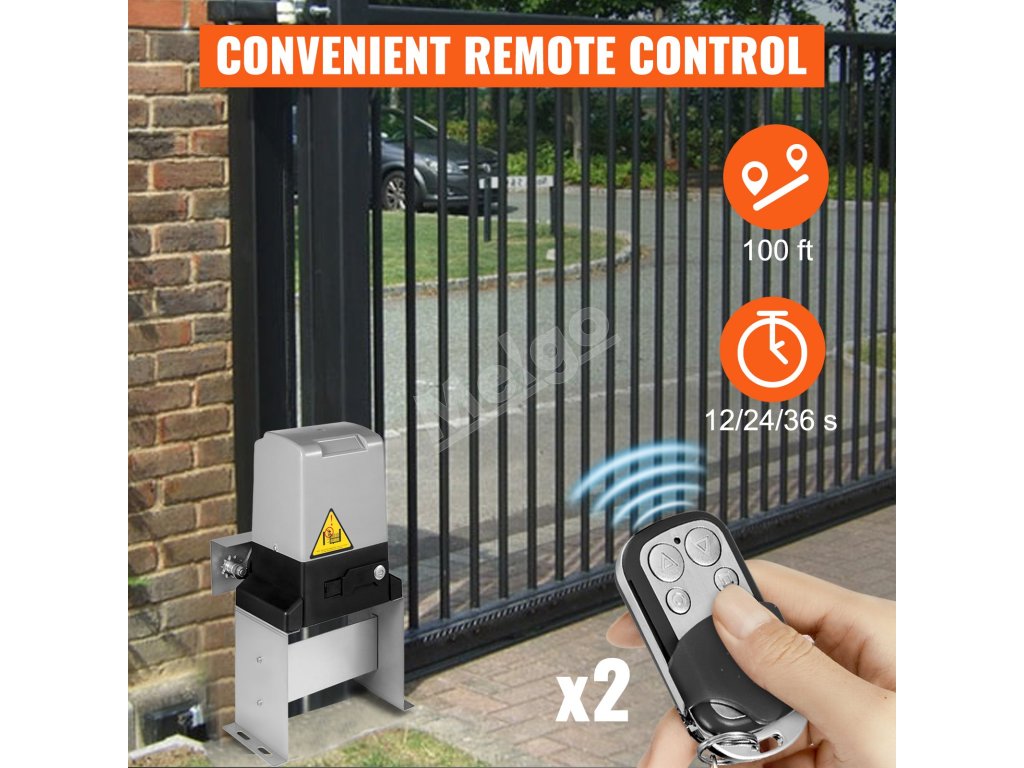 Náš automatický otvárač posuvných brán je vybavený 2 bezdrôtovými diaľkovými ovládačmi. Pomocou 4-tlačidlových diaľkových ovládačov môžete bránu otvárať, zatvárať, zastavovať alebo používať režim pre chodcov. Diaľkové ovládače dokážu pracovať v dosahu až viac ako 100 stôp, takže nemusíte čakať pri bráne pri každom príchode domov. Funkciu automatického zatvárania možno nastaviť na 12, 24 alebo 36 sekúnd s možnosťou deaktivácie. Kľúč na núdzové uvoľnenie umožňuje vstupovať alebo odchádzať aj v prípade výpadku elektrického prúdu.