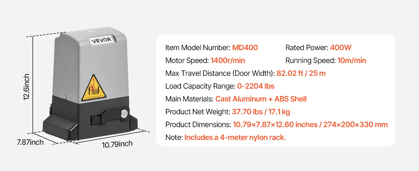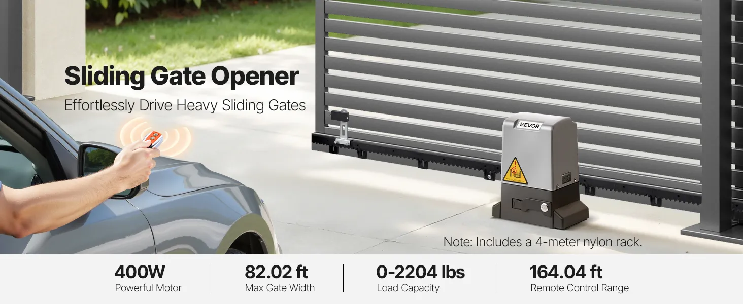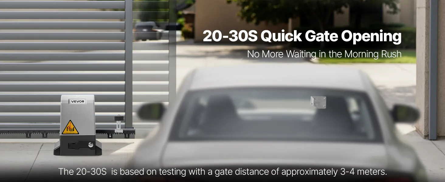 Tento otvárač brán je vybavený 400W motorom z čistej medi, ktorý zvládne brány široké až 82,02 ft / 25 m a s hmotnosťou 2204 lbs / 1000 kg, ponúka plynulú a rýchlu prevádzku (10 m/min), ktorá šetrí váš čas. Vďaka infračervenej technológii automatického snímania zabraňuje kolíziám, čím zabezpečuje bezpečnosť vašej rodiny a domácich zvierat.