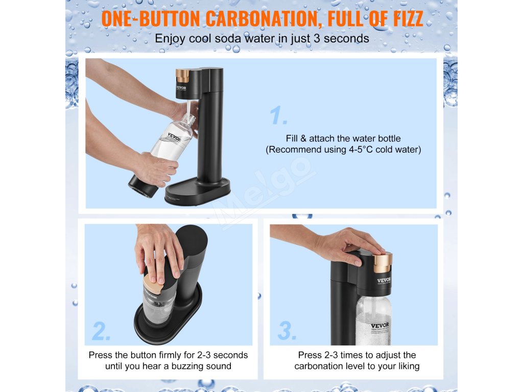 Náš výrobník sódy je navrhnutý tak, aby bol ľahko použiteľný a dodával chladnú sódu za iba 3 sekundy. Odporúčame používať studenú vodu s teplotou 4–5 °C, aby boli bublinky bohatšie a chuť lepšia.