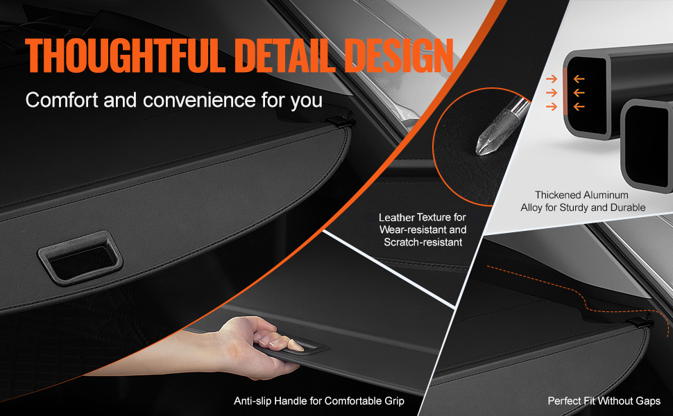 Hlavné telo zaťahovacieho krytu batožinového priestoru je vyrobené zo zosilnenej hliníkovej zliatiny pre zvýšenú odolnosť, protišmykový dizajn rukoväte pre pohodlné uchopenie a povrch s koženou textúrou, ktorý je odolný proti opotrebovaniu a poškriabaniu.