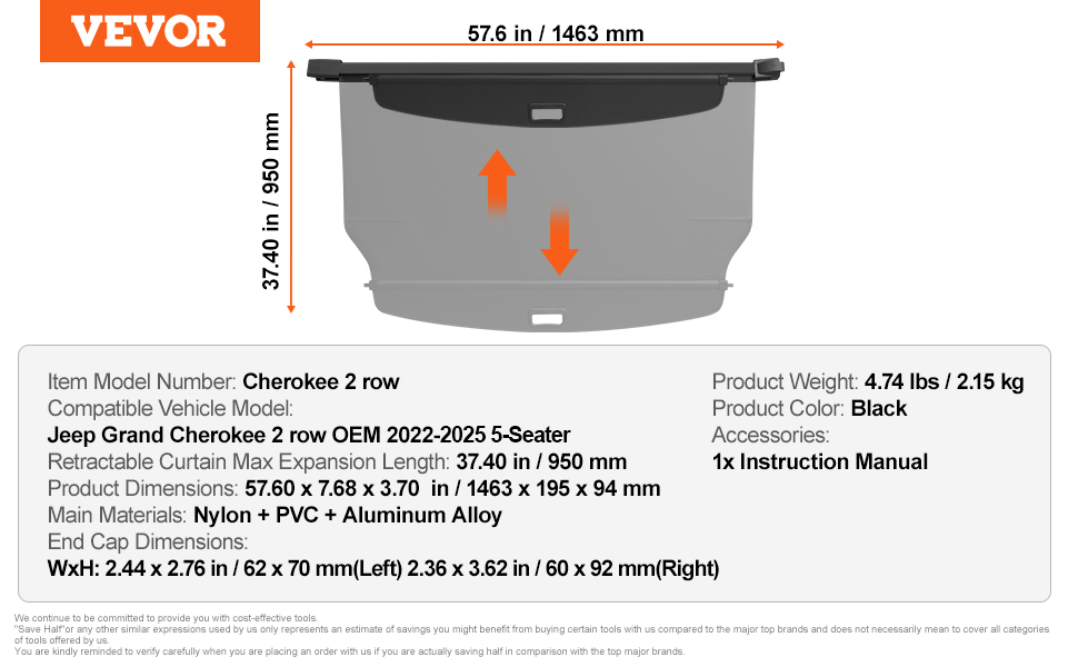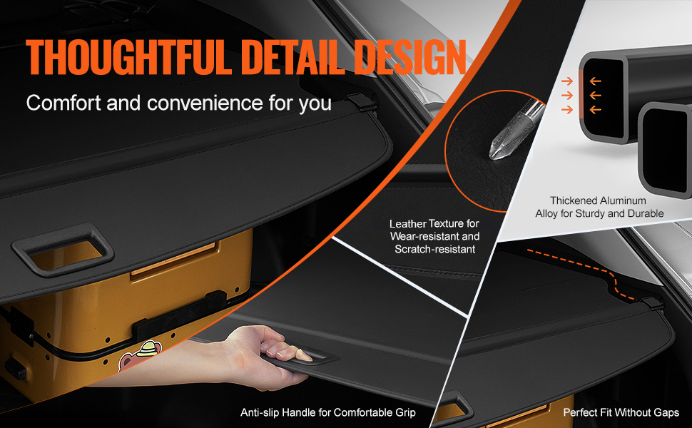 Hlavné telo zaťahovacieho krytu batožinového priestoru je vyrobené zo zosilnenej hliníkovej zliatiny pre zvýšenú odolnosť, protišmykový dizajn rukoväte pre pohodlné uchopenie a povrch s koženou textúrou, ktorý je odolný proti opotrebovaniu a poškriabaniu.