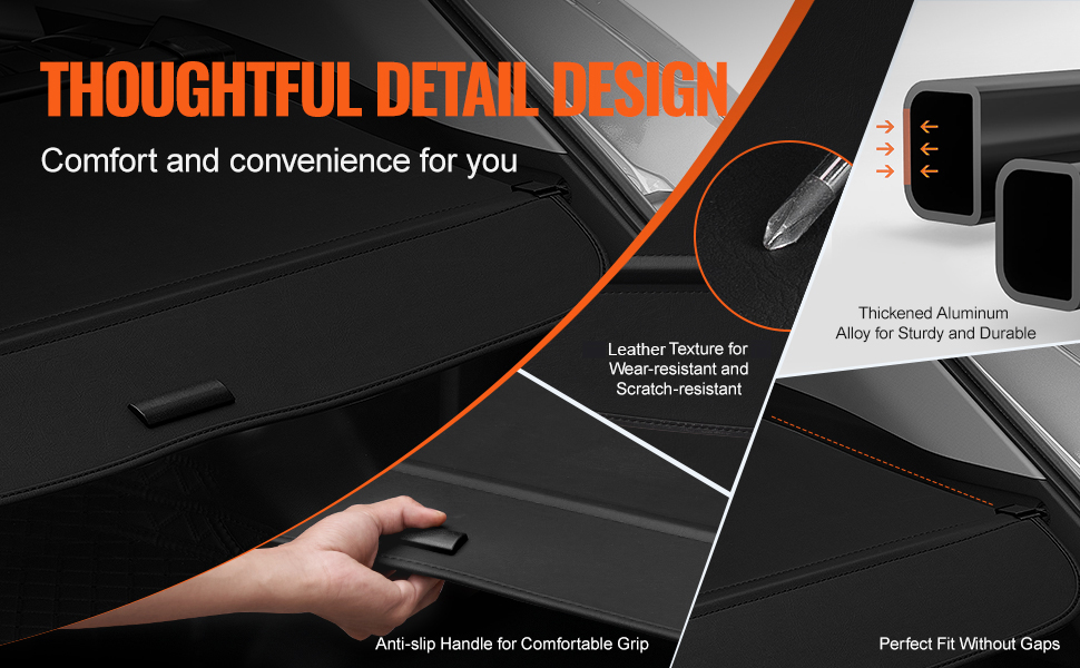 Hlavné telo zaťahovacieho krytu batožinového priestoru je vyrobené zo zosilnenej hliníkovej zliatiny pre zvýšenú odolnosť, protišmykový dizajn rukoväte pre pohodlné uchopenie a povrch s koženou textúrou, ktorý je odolný proti opotrebovaniu a poškriabaniu.