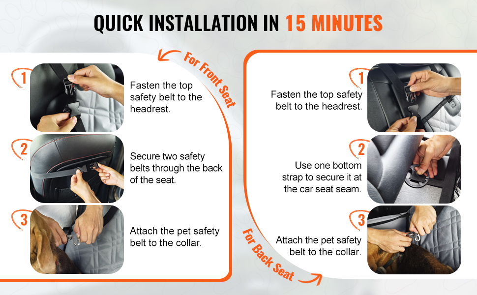 Obsahuje nastaviteľné bezpečnostné pásy a bezpečnostný popruh pre domáce zviera na bezpečné upevnenie. Dostatočne jednoduchá inštalácia pre jednu osobu.