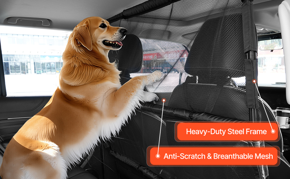 Táto zábrana pre psa do vozidla SUV, vyrobená s oceľovým rámom a prvotriednou, hrubou polyesterovou tkaninou, poskytuje zvýšenú odolnosť a stabilitu. Nemusíte sa obávať, že váš domáci miláčik bude mať pazúry alebo ich bude hrýzť. Umožňuje tiež voľné prúdenie chladného alebo teplého vzduchu klimatizácie, čím zabezpečuje priedušnosť a pohodlie.