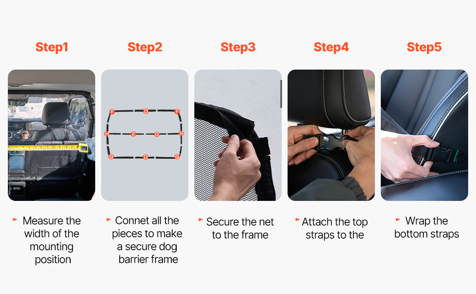 Naša zábrana pre psov do auta nevyžaduje žiadne vŕtanie. Stačí nainštalovať kovový rám a sieťku, potom upevniť sponu okolo opierky hlavy predného sedadla a rámu, aby ste ju mohli rýchlo nastaviť.