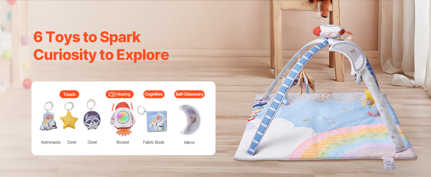Stimulujte zvedavosť svojho bábätka pomocou našich 6 interaktívnych hračiek. Svietiaca hudobná hračka raketa, zaujímaví astronauti, hviezdička, hlava civeta, zrkadlo na sebapoznávanie a látková knižka stimulujú sluchový, hmatový, vizuálny a kognitívny vývoj dieťaťa.