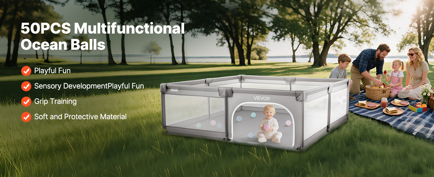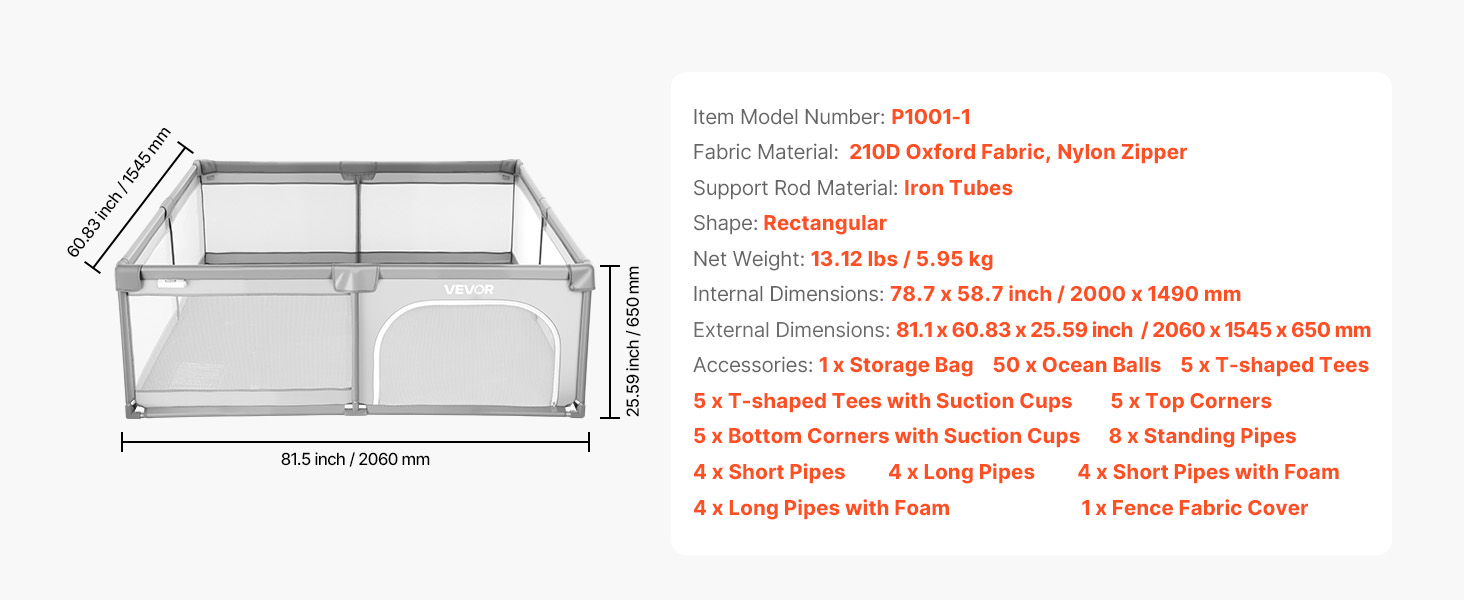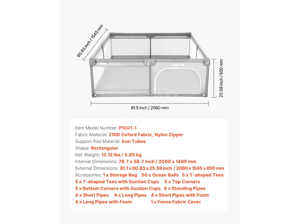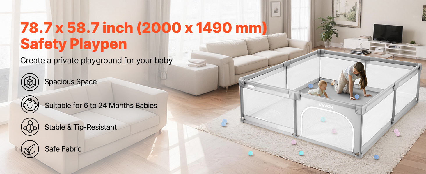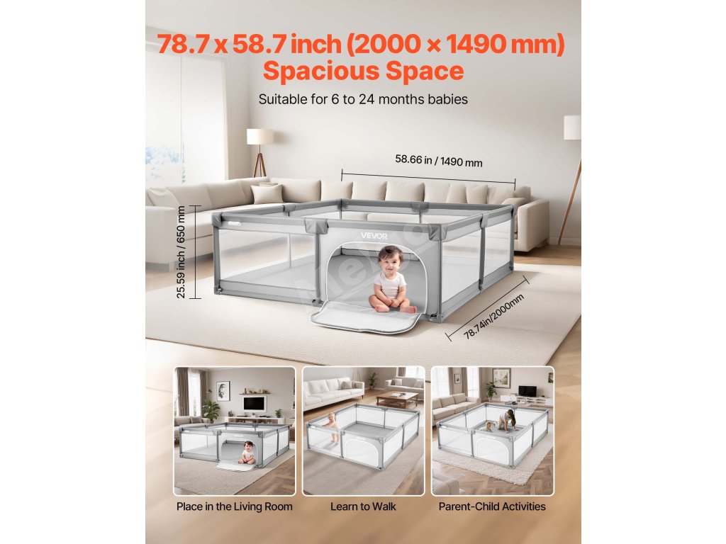 Vytvorte pre svoje dieťatko bezpečný a zábavný priestor na hranie s veľkou detskou ohrádkou VEVOR s rozmermi 78,7 x 58,7 palca (vnútorný rozmer 2000 x 1490 mm). Táto priestranná hracia ohrádka je určená pre batoľatá od 6 do 24 mesiacov a je ideálna na to, aby pomohla vášmu dieťaťu naučiť sa chodiť, hrať sa, objavovať a užívať si čas strávený s rodičmi a deťmi.