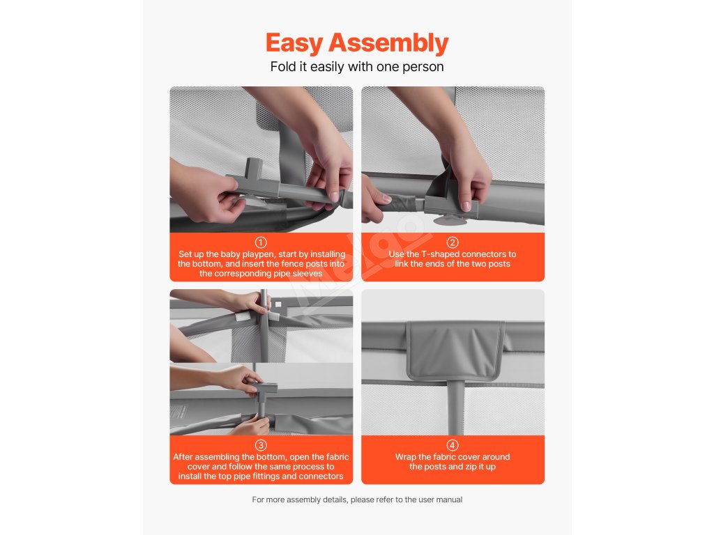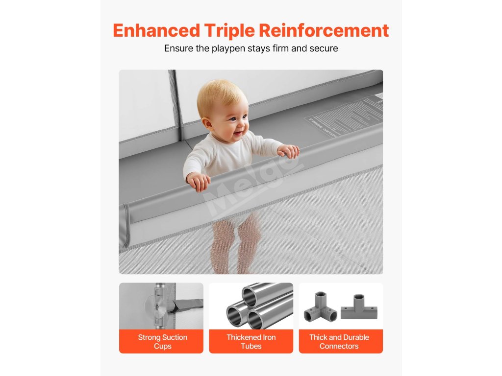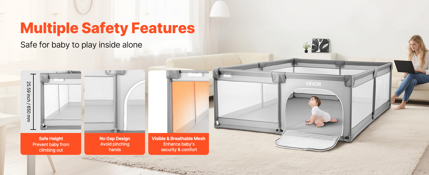 Nechajte svoje dieťatko bezpečne sa hrať, zatiaľ čo vy si budete môcť užívať pokoj. Táto ohrádka pre batoľatá má vedecky navrhnutú výšku, ktorá zabraňuje vyliezaniu dieťaťa, štruktúru bez medzier, aby sa zabránilo skrehnutiu prstov, a priedušnú sieťovinu na optimálne prúdenie vzduchu a viditeľnosť. Upozornenie: Hracia podložka nie je súčasťou balenia, pripravte si ju prosím samostatne.