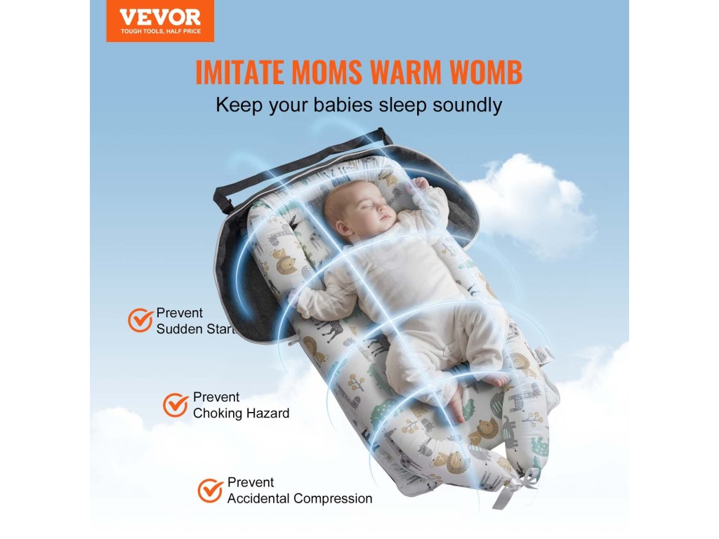 Detské ležadlo VEVOR má obojstranný dizajn so 100 % bavlnenou tkaninou, ktorá poskytuje mäkký a jemný dotyk pre dieťa. Jeho opierka hlavy, 360° objatie a bezpečné nárazníky napodobňujú teplo a bezpečie maminho objatia, čím zabezpečujú vášmu dieťatku bezpečný a pohodlný spánok.