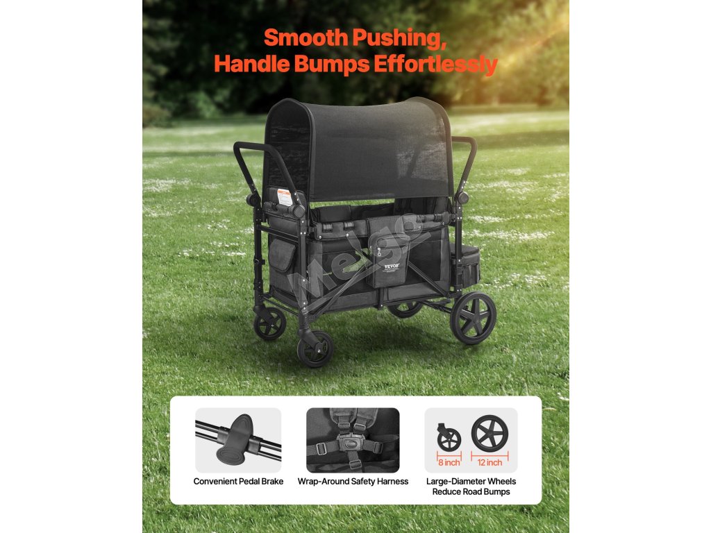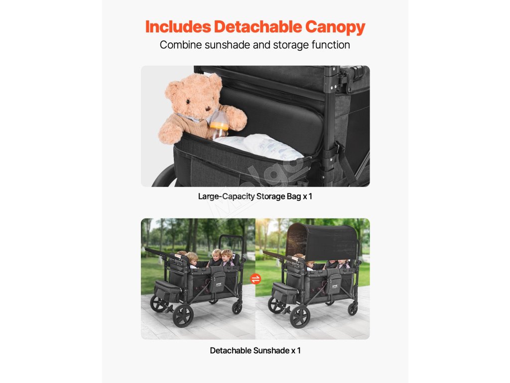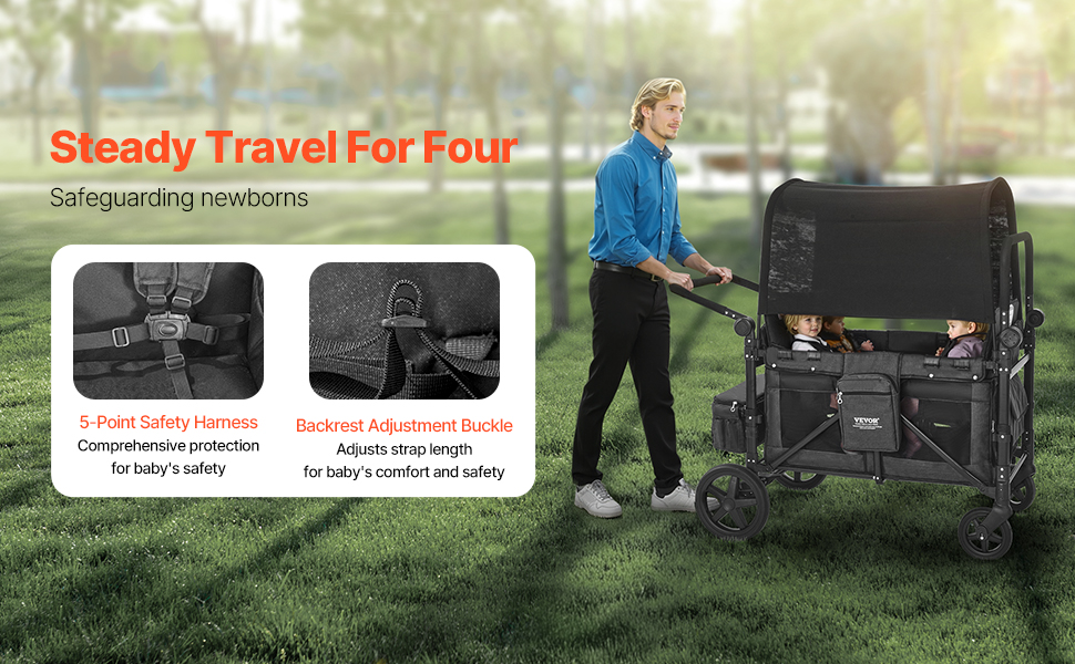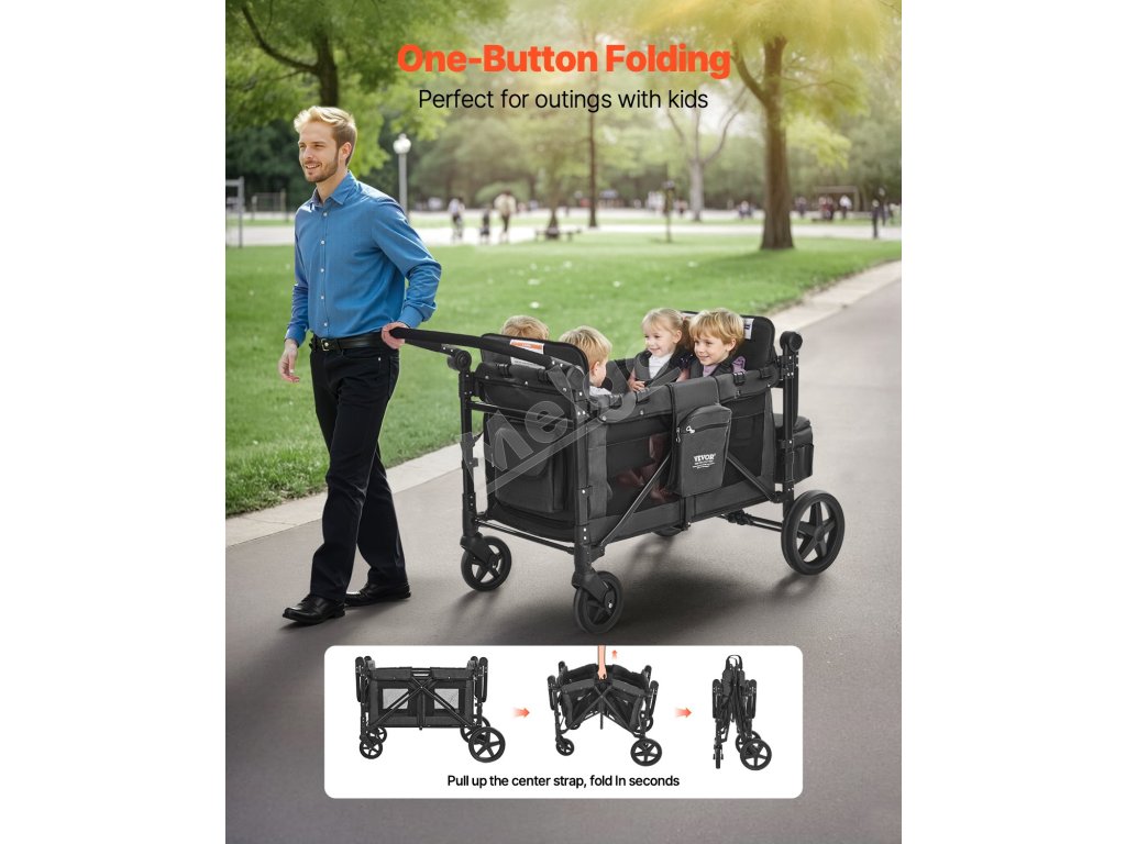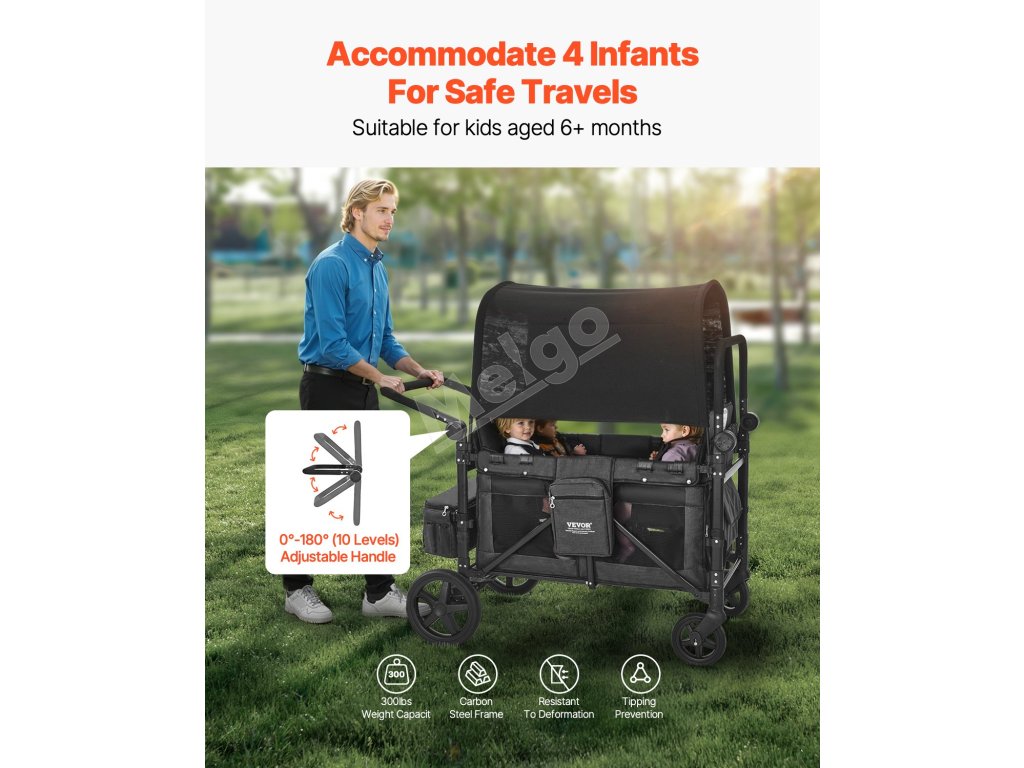 Užívajte si bezproblémový život a zažívajte zábavné dobrodružstvá so svojím dieťaťom! Náš vozík pre 4 deti je skladací a prenosný, pohodlne sa zmestí do kufra auta alebo domov. Vďaka rámu z uhlíkovej ocele a kolesám odolným voči opotrebovaniu, ktoré absorbujú nárazy, sa prispôsobí rôznym terénom.