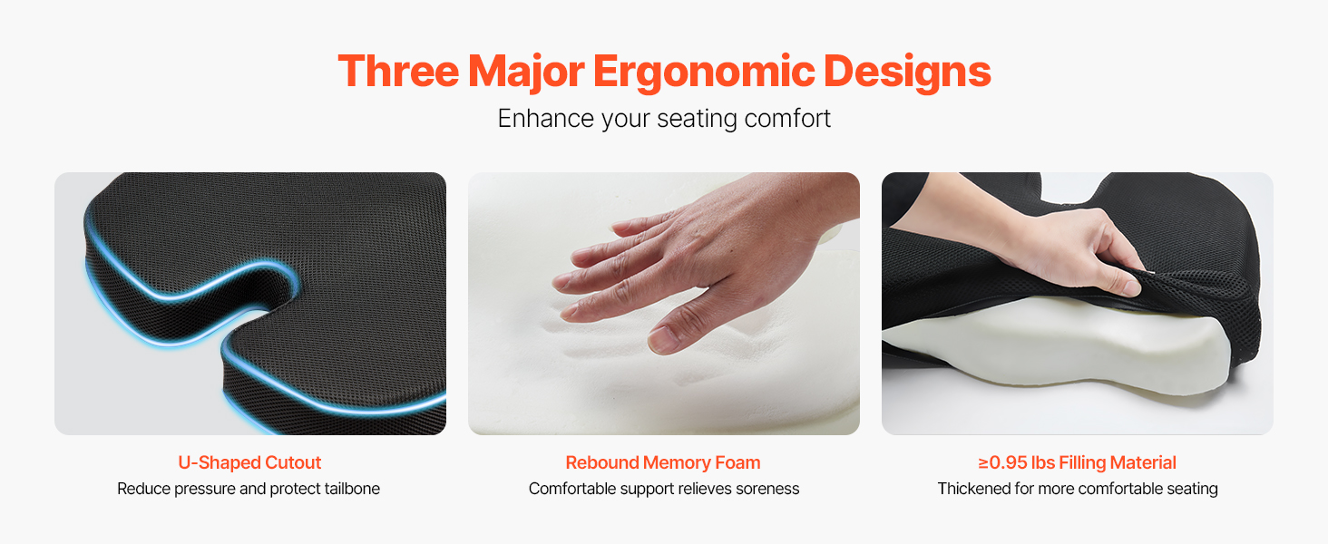 3 hlavné ergonomické konštrukcie pre väčšie pohodlie - výrez v tvare U znižuje tlak na chrbtovú kosť a chráni chrbticu, odrazová pamäťová pena poskytuje mäkké, podporné polstrovanie na zmiernenie bolestivosti a výplňový materiál ≥ 0,95 lbs ponúka hustejšie a pohodlnejšie sedenie.