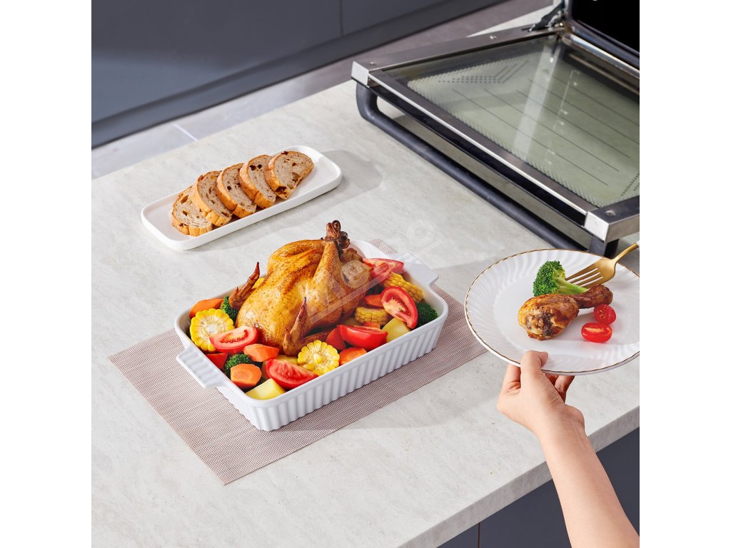 Úžasných riadov na pečenie nie je nikdy dosť. Náš keramický riad na pečenie s dvojitou rukoväťou sa vyznačuje ručne lisovanými textúrovanými detailmi a luxusným vysokoteplotným procesom pod glazúrou. Jemné, elegantné farby z nej robia krásny doplnok do vašej kuchyne, ideálny na štýlové a jednoduché servírovanie jedla.