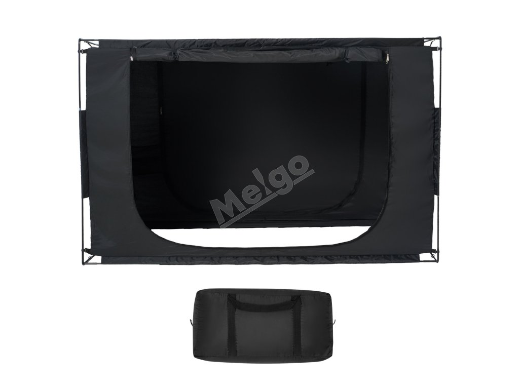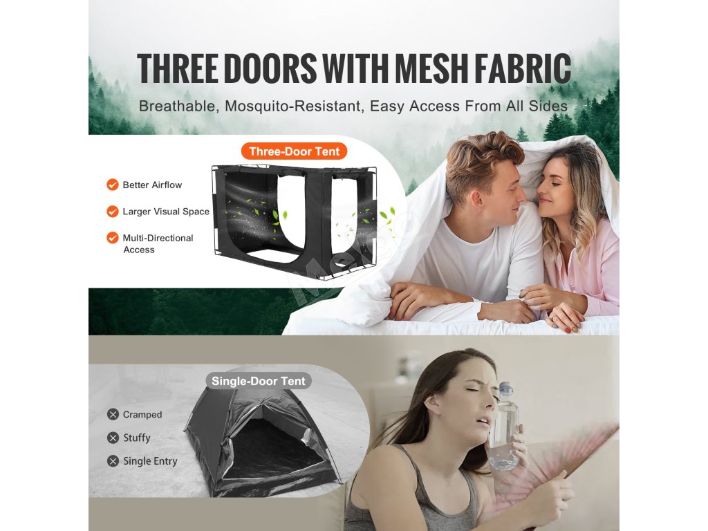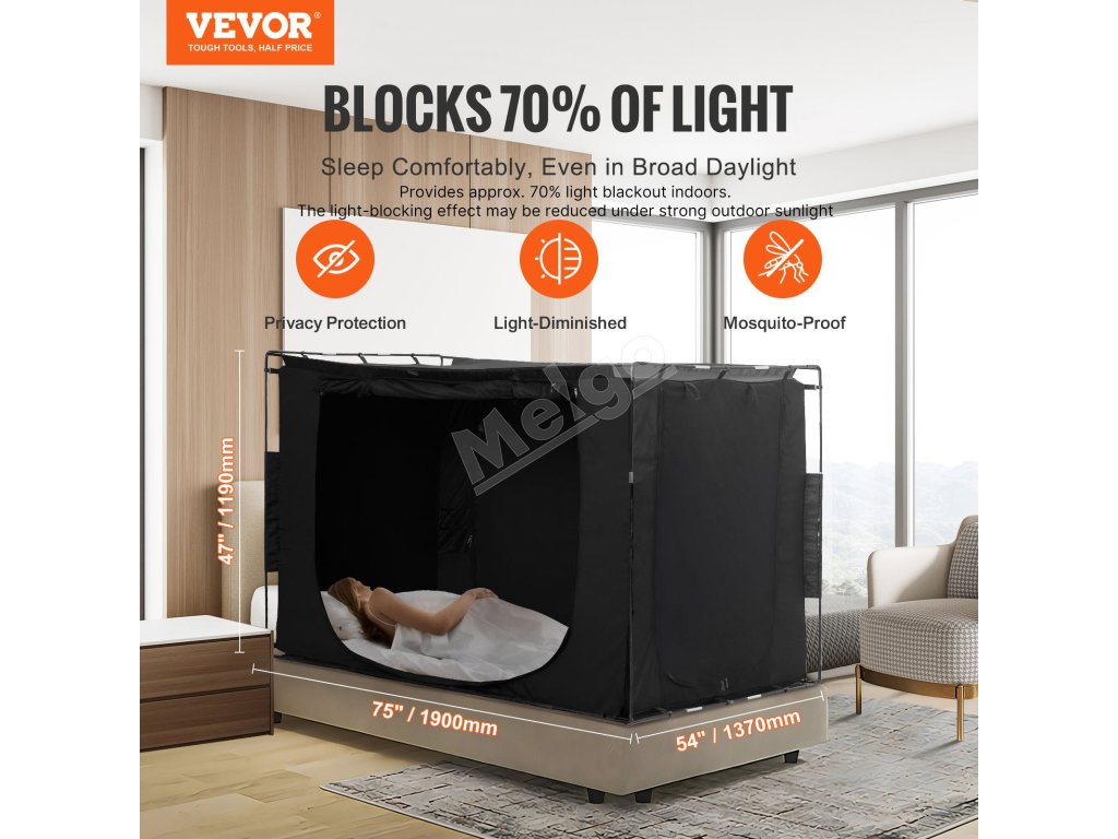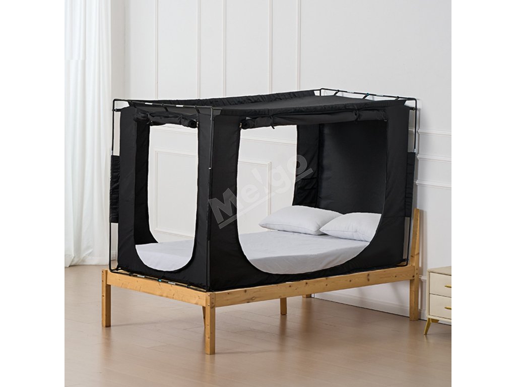 Posteľný stan s rozmermi 75" x 54" x 47" (1900 x 1370 x 1190 mm) ponúka 70 % blokovanie svetla pre súkromie v akomkoľvek priestore. Je vybavený tromi vstupnými bodmi so sieťovinou a látkou na ochranu súkromia, ako aj vreckom na telefón, háčikom na nočné svetlo a suchým zipsom na nabíjanie. Postavený je z pevných tyčí s vláknami a odolnej tkaniny s hmotnosťou 80 g (0,18 kg).
