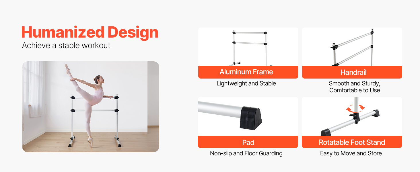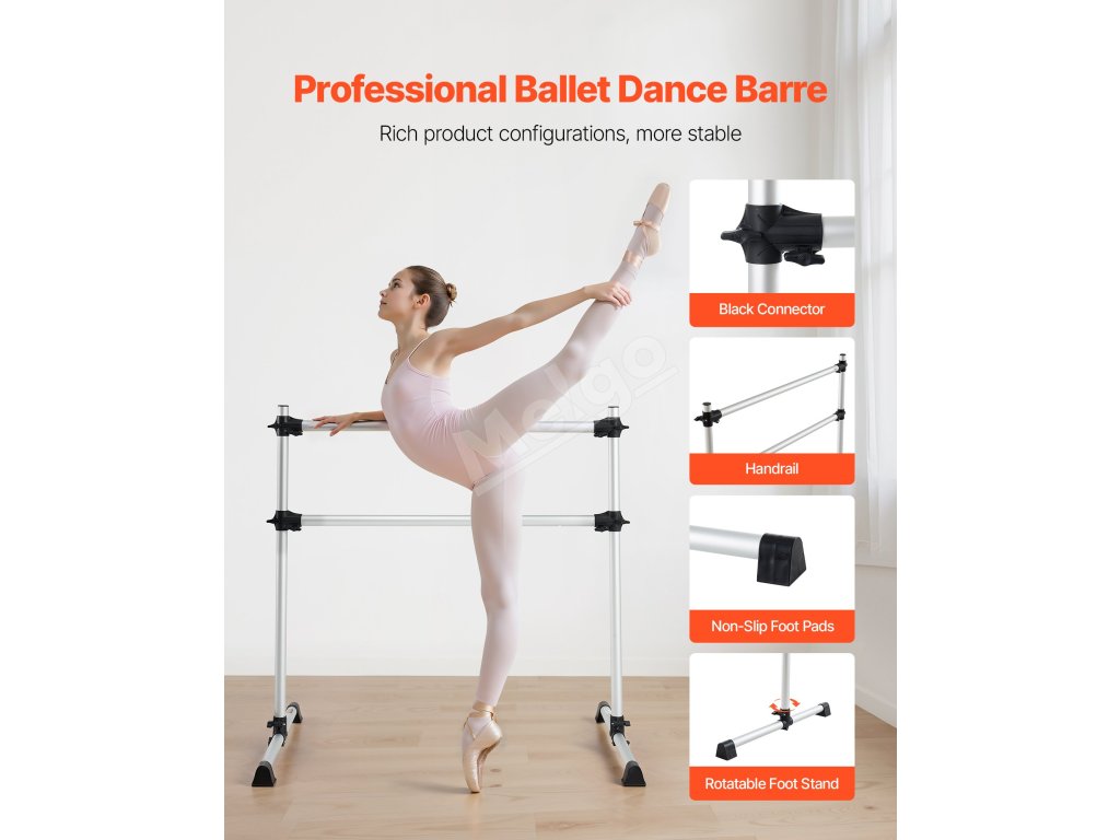 Tanečná tyč je vyrobená s hliníkovým rúrkovým madlom, je odolná a pohodlne sa drží. Je vybavená veľkými protišmykovými podložkami, ktoré chránia vašu podlahu pred poškriabaním. Dodá eleganciu a pôvab každej miestnosti vo vašej domácnosti alebo tanečnom štúdiu. Otočný stojan na nohy uľahčuje jej premiestňovanie a skladovanie.