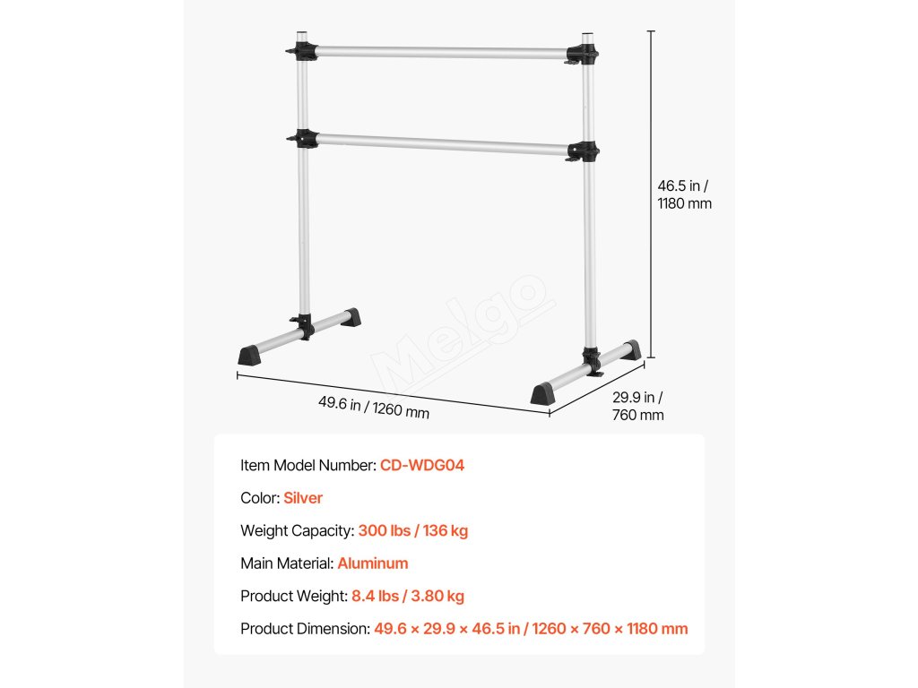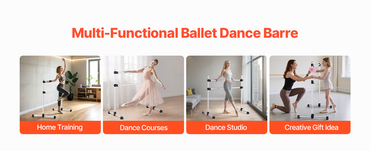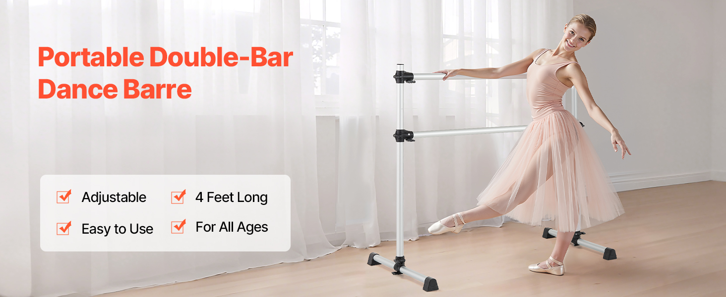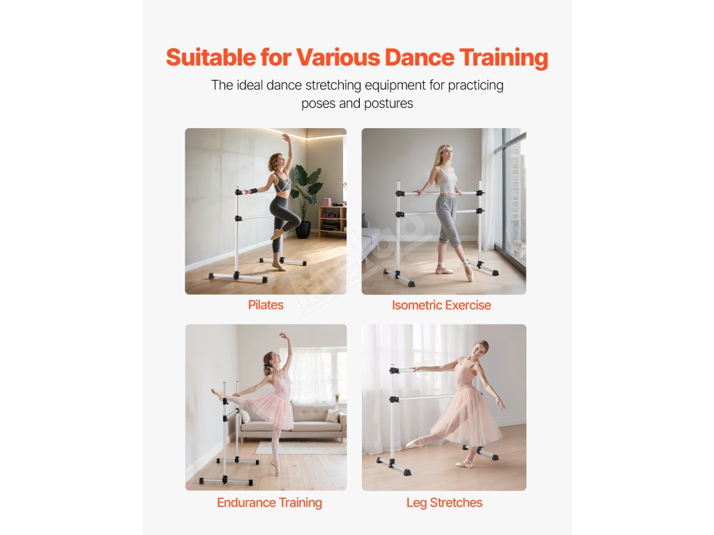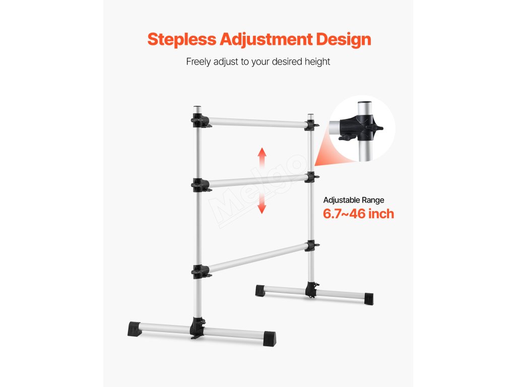 Výškovo nastaviteľná baletná tyč má dve 4-metrové tyče s nastaviteľnou výškou zdola nahor. Rozsah nastavenia: 6.7 až 46 palcov / 170-1165 mm. Jednoduchým otáčaním gombíka ľahko nastavíte výšku podľa svojich potrieb.