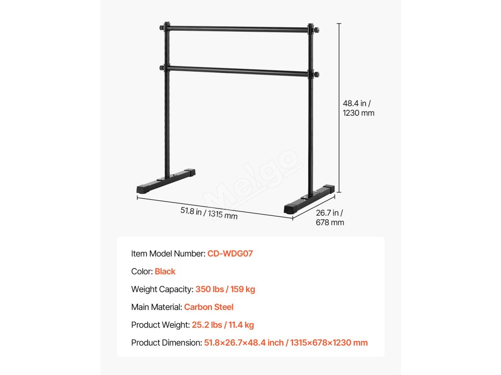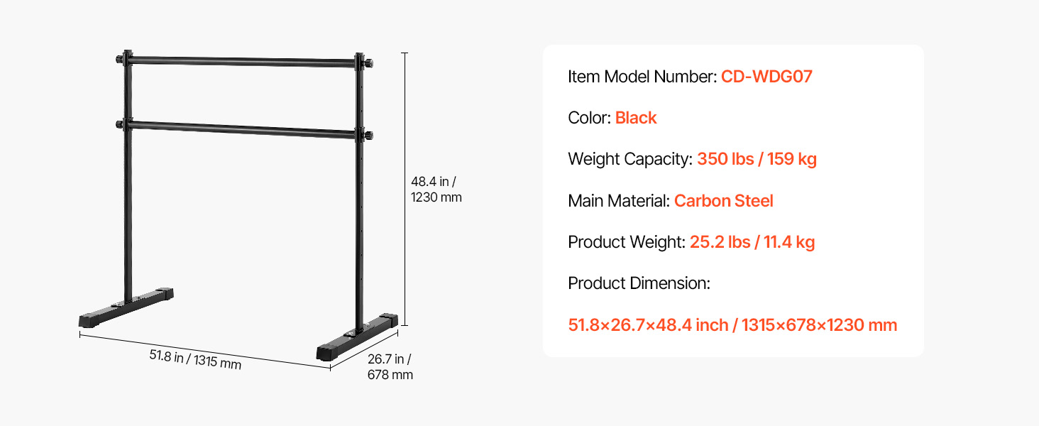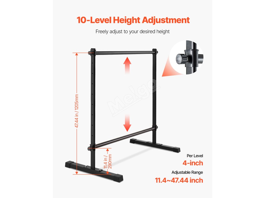 S 10 výškovými nastaveniami, každé s prírastkom 4 palce, nastaviteľný rozsah od 11,4 do 47,44 palca / 290-1205 mm. Táto výškovo nastaviteľná baletná tyč je vybavená aj bočnou rukoväťou s aretáciou na jednoduché nastavenie výšky.