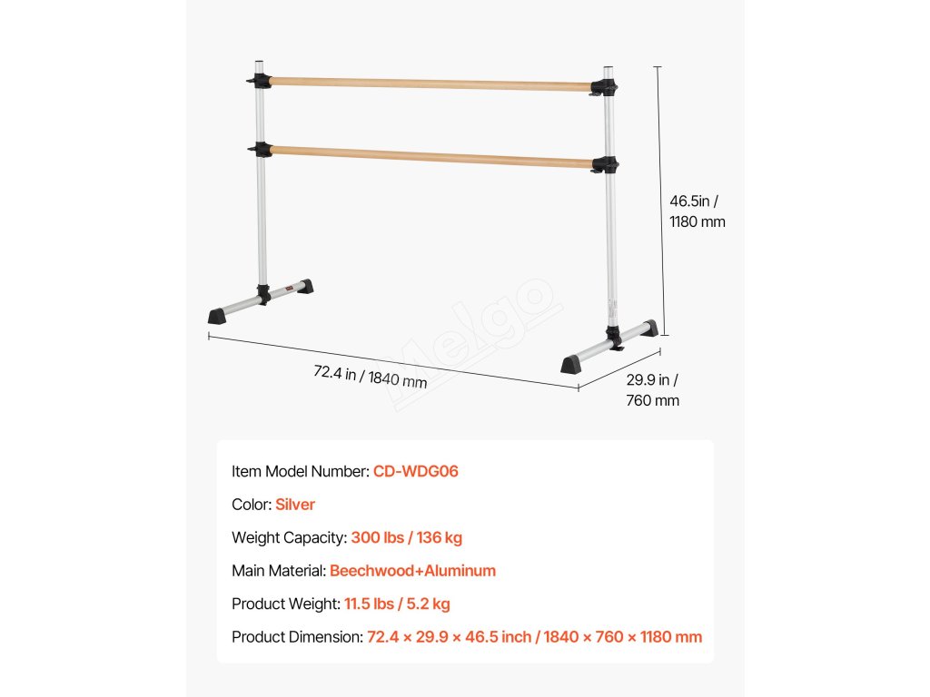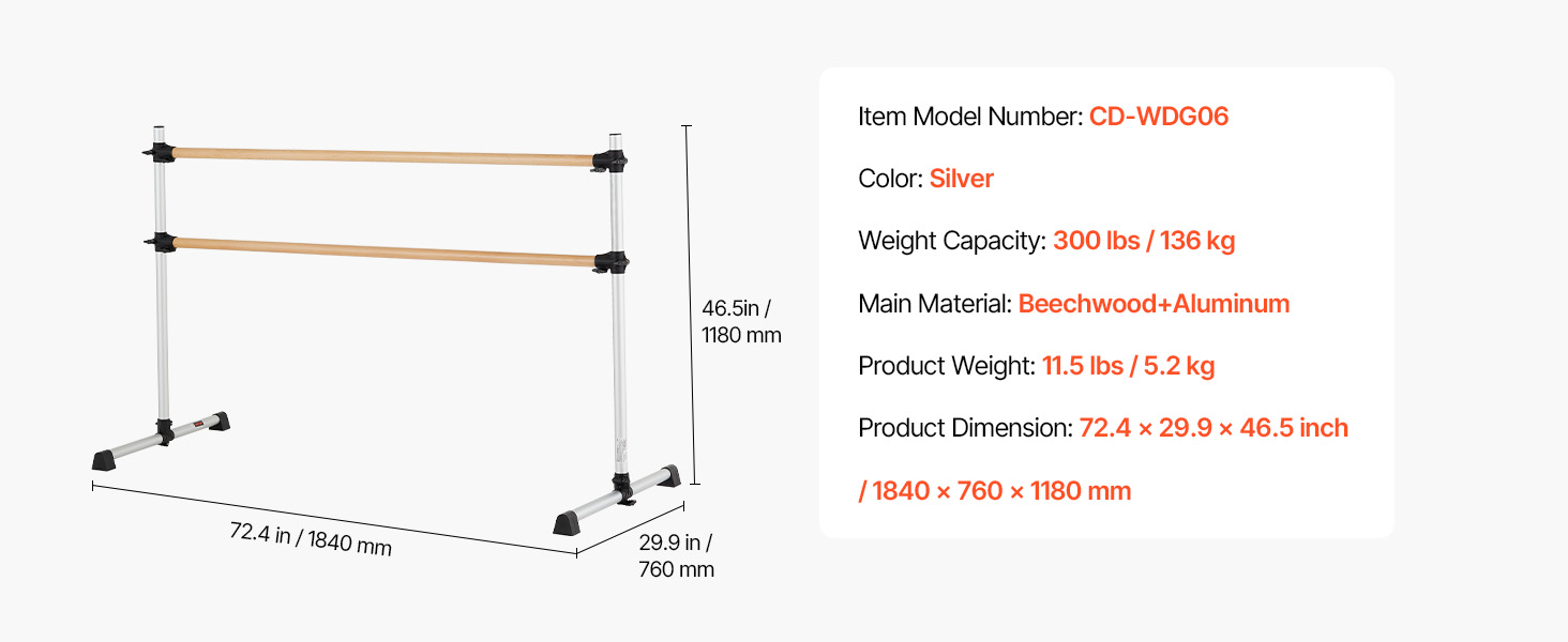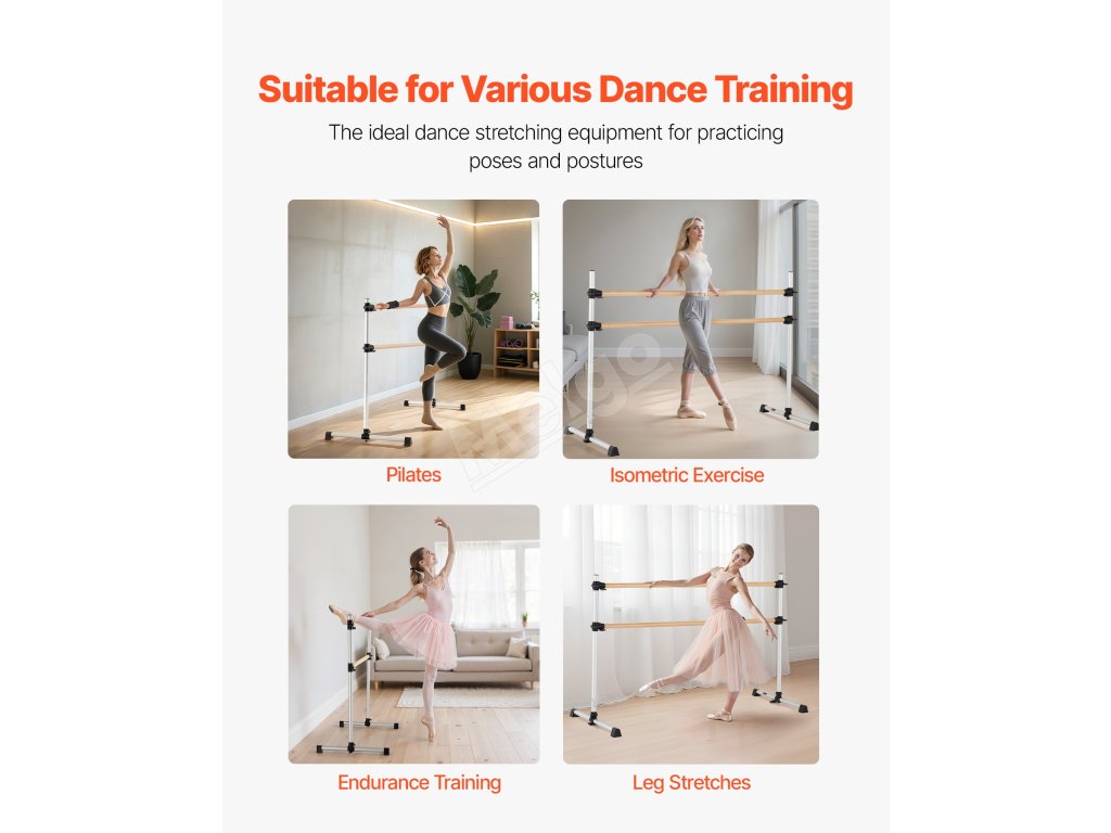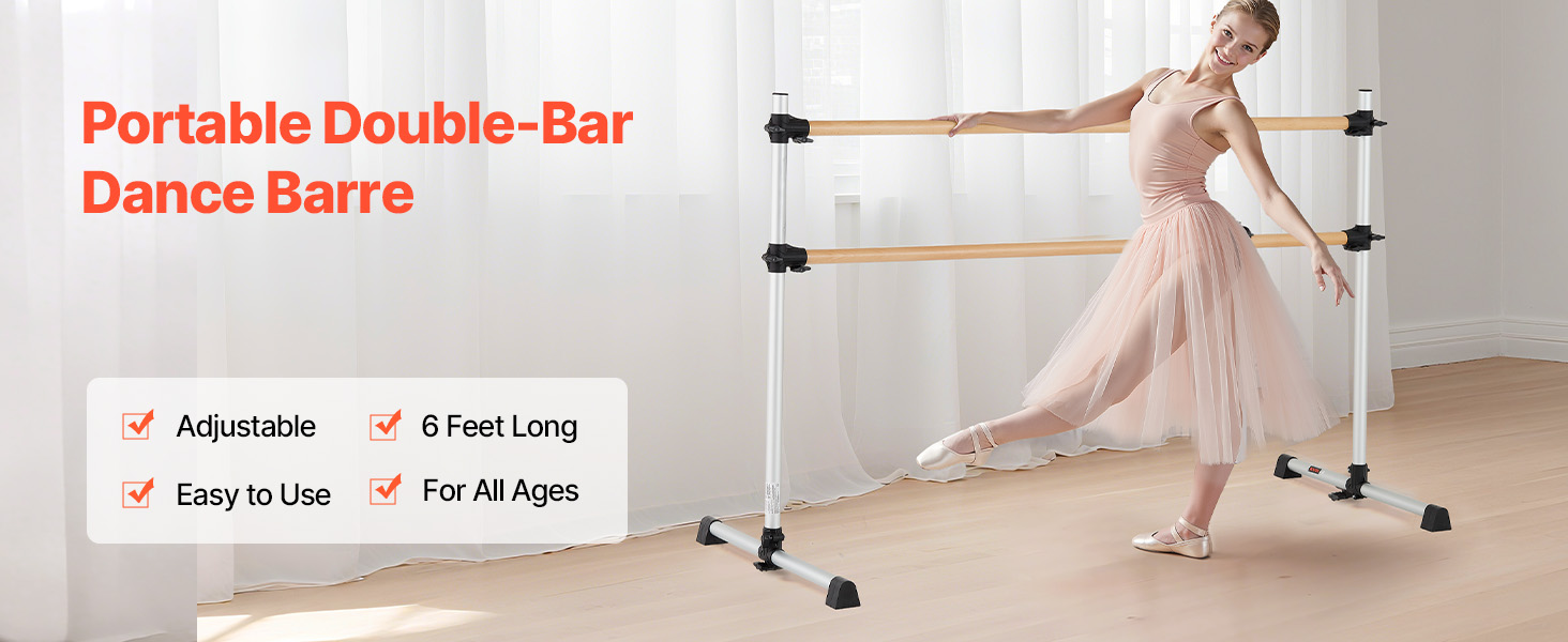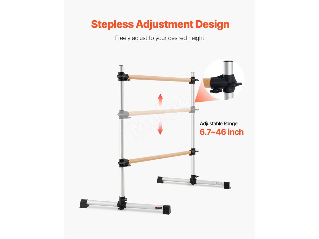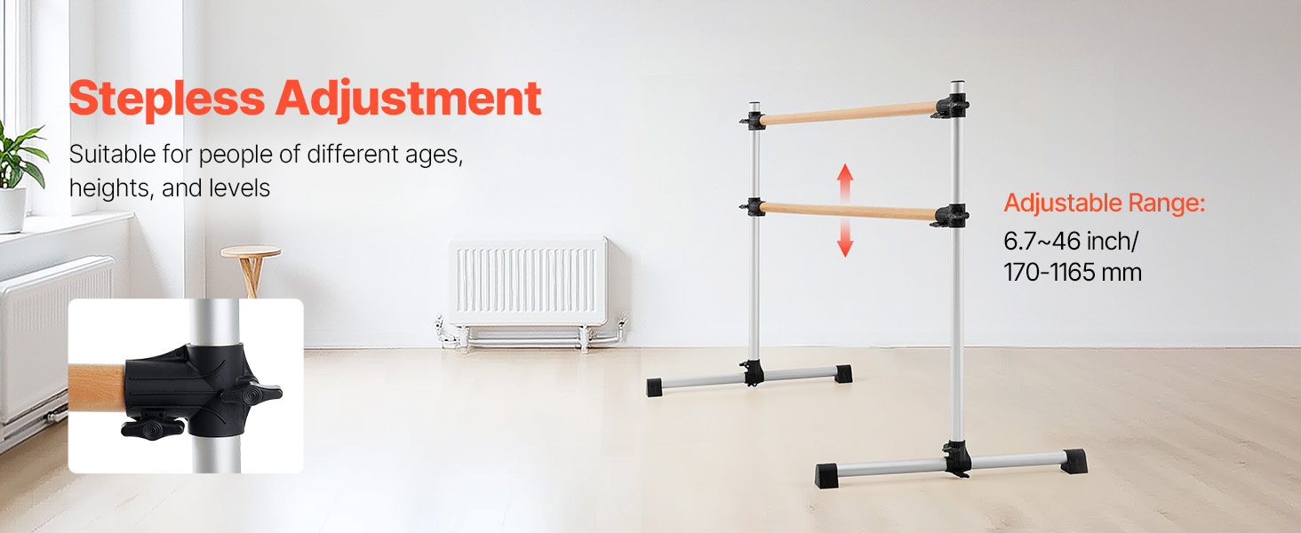 Výškovo nastaviteľná baletná tyč má dve 6 stôp dlhé drevené tyče s nastaviteľnou výškou zdola nahor. Rozsah nastavenia: 6.7 až 46 palcov / 170-1165 mm. Jednoduchým otáčaním gombíka ľahko nastavíte výšku podľa svojich potrieb.