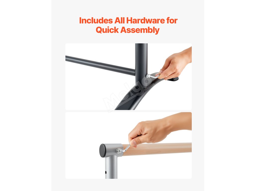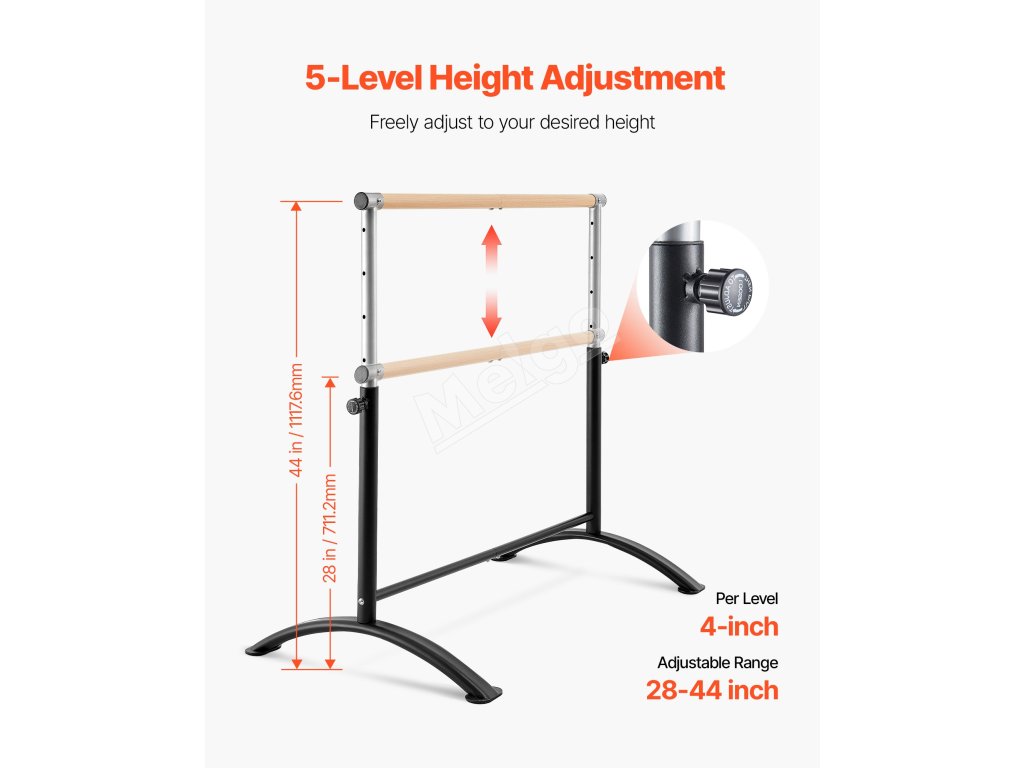 S 5 výškovými nastaveniami, každé s prírastkom 4 palce, nastaviteľný rozsah od 28 do 44 palcov. Táto výškovo nastaviteľná baletná tyč je vybavená aj uzamykateľnou rukoväťou na boku na jednoduché nastavenie výšky.
