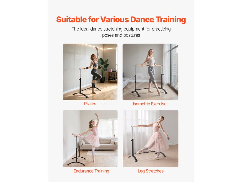 Povrch tanečnej tyče má povrchovú úpravu so štruktúrou dreva, ktorá poskytuje lepší pocit. Je vybavená veľkými protišmykovými podložkami, ktoré chránia vašu podlahu pred poškriabaním. Dodá eleganciu a pôvab každej miestnosti vo vašej domácnosti alebo tanečnom štúdiu. Otočný stojan na nohy uľahčuje jej premiestňovanie a skladovanie.