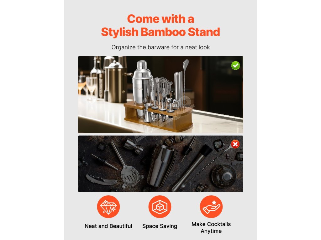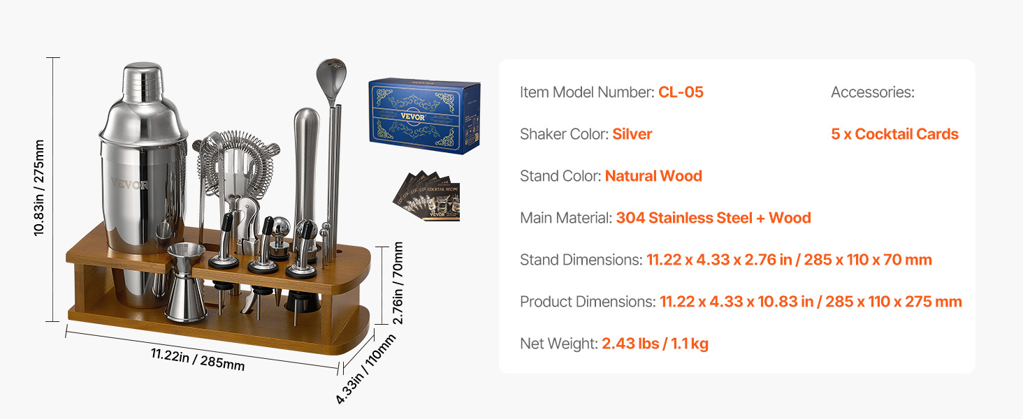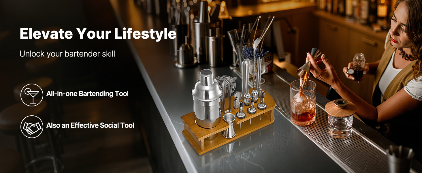 Táto barmanská súprava poskytuje všetky štandardné nástroje, ktoré potrebujete na rýchly začiatok, od začiatočníka až po majstra domáceho barmanstva a zlepšuje váš životný štýl. Premeňte svoje spoločenské stretnutia z obyčajných na kreatívne a očarujúce.