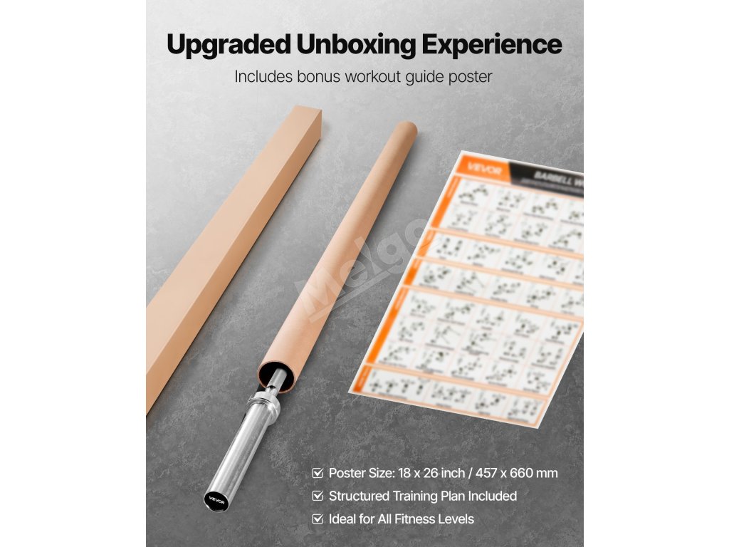 Tyč na činky má precízne vrúbkovanie a priemer úchopu 28 mm na bezpečné a ergonomické držanie. Konce so zacvakávacími krúžkami udržiavajú dosky pevne na mieste, čím zabezpečujú stabilitu a bezpečnosť počas každého tréningu.