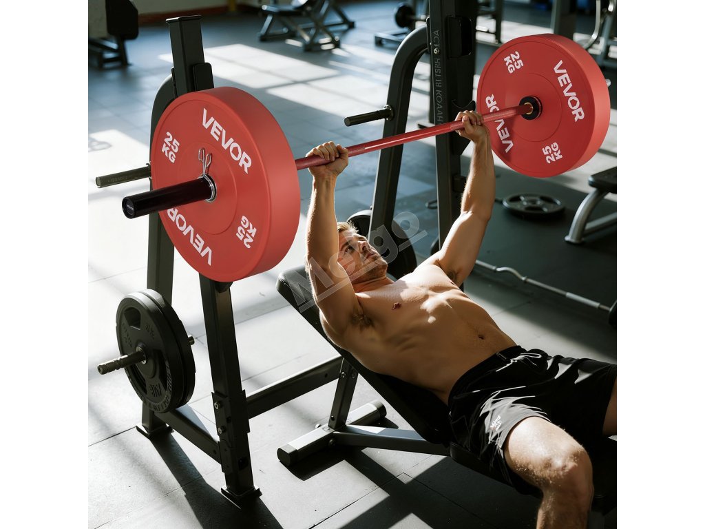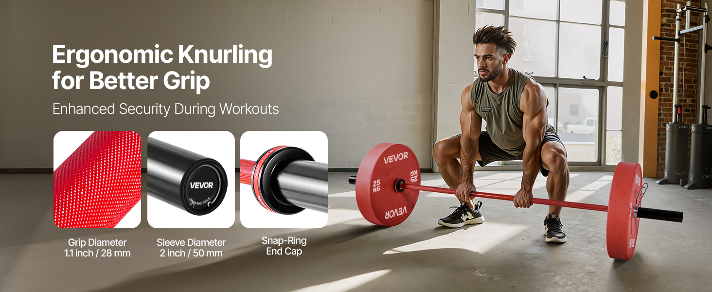 Tyč na činky je vybavená presným vrúbkovaním a priemerom úchopu 28 mm na bezpečné a ergonomické držanie. Vďaka koncovým zacvakávacím krúžkom sú dosky pevne na svojom mieste, čo zaručuje stabilitu a bezpečnosť počas každého tréningu.