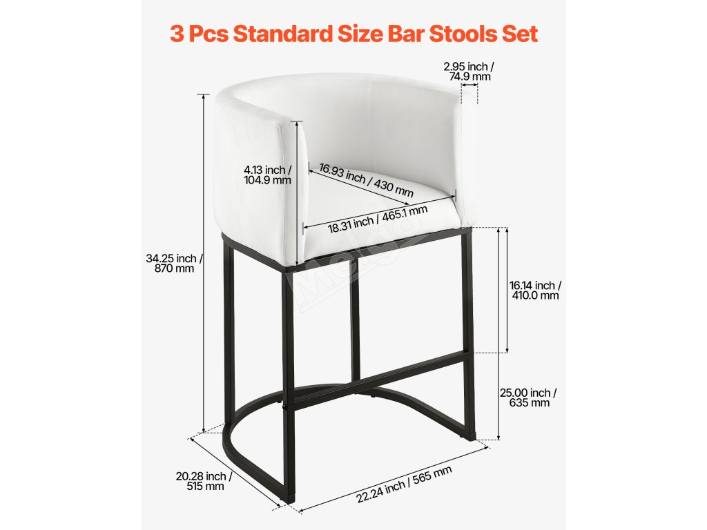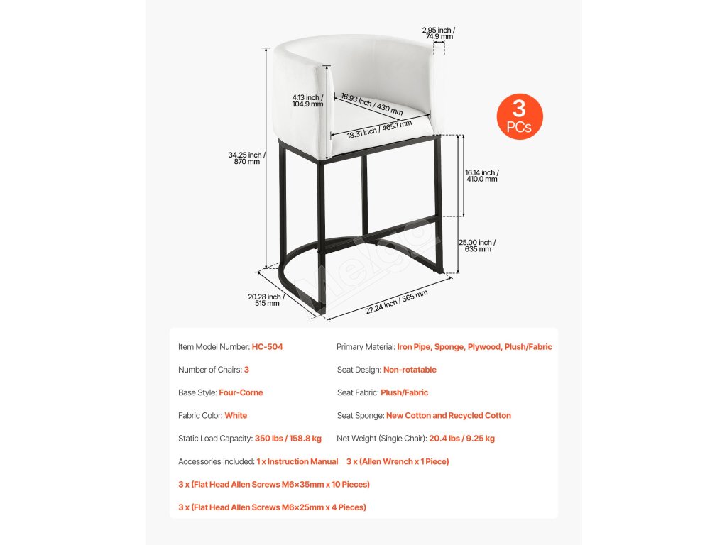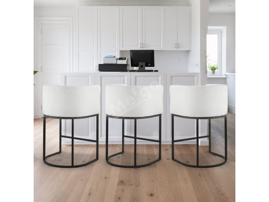 Barové stoličky 3 ks, 63cm, biele látkové, kovový rám, opieradlo