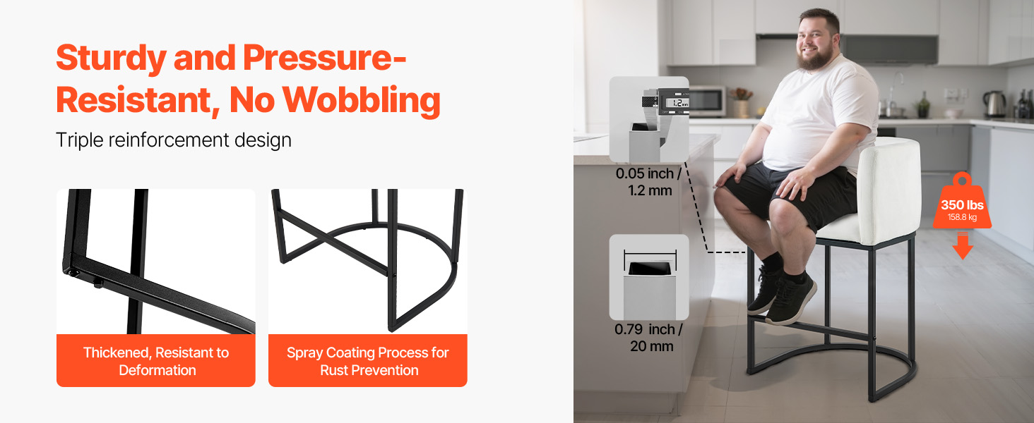 Vďaka zhrubnutým železným rúrkam a štvorhrannej stabilnej konštrukcii ponúka táto barová stolička ku kuchynskej linke výnimočnú oporu, ktorá zabraňuje kolísaniu alebo prehýbaniu. Je vybavená procesom striekania odolného proti korózii, čo zabezpečuje väčšiu stabilitu a odolnosť.