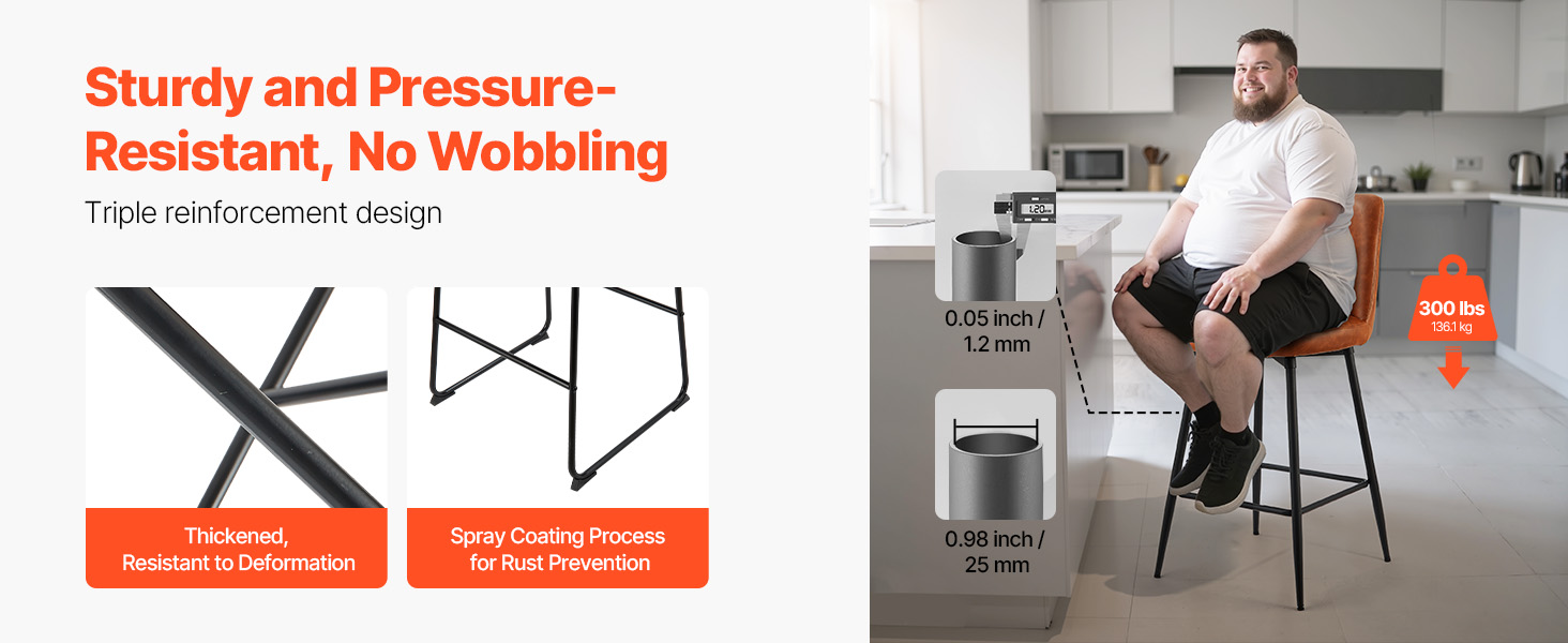 Vďaka zhrubnutým železným rúrkam a stabilnej konštrukcii so štyrmi rohmi ponúka táto barová stolička ku kuchynskej linke výnimočnú oporu, ktorá zabraňuje kolísaniu alebo prehýbaniu. Je vybavená procesom striekania odolného proti korózii, čo zabezpečuje väčšiu stabilitu a odolnosť.