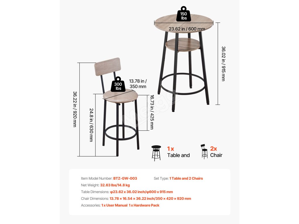 Tento kuchynský stôl s barovou stoličkou s výškou 36,02 palca/915 mm je navrhnutý s ohľadom na praktickosť. Jeho výška poskytuje pohodlný, ničím nerušený priestor na nohy a prináša príjemný zážitok.