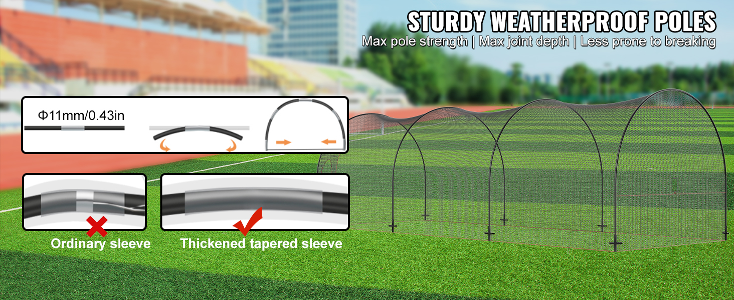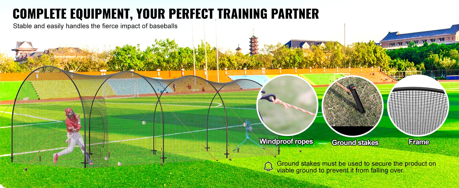 Ideálna zostava baseballovej odpaľovacej klietky, ktorá v spojení s nadhadzovacím strojom zvládne rýchlosť loptičky až 90 míľ za hodinu. Konštrukcia obsahuje viacero zemných kolov na spevnenie, ktoré zabezpečujú odolnosť a stabilitu.