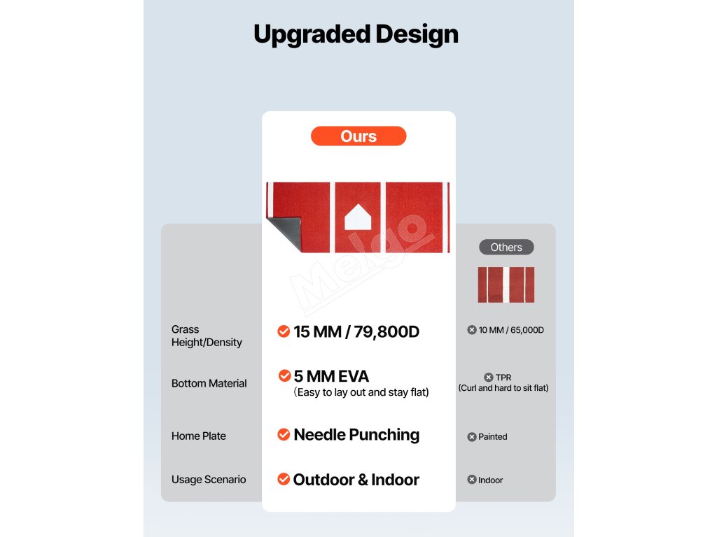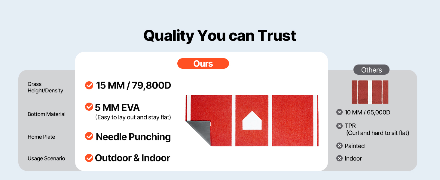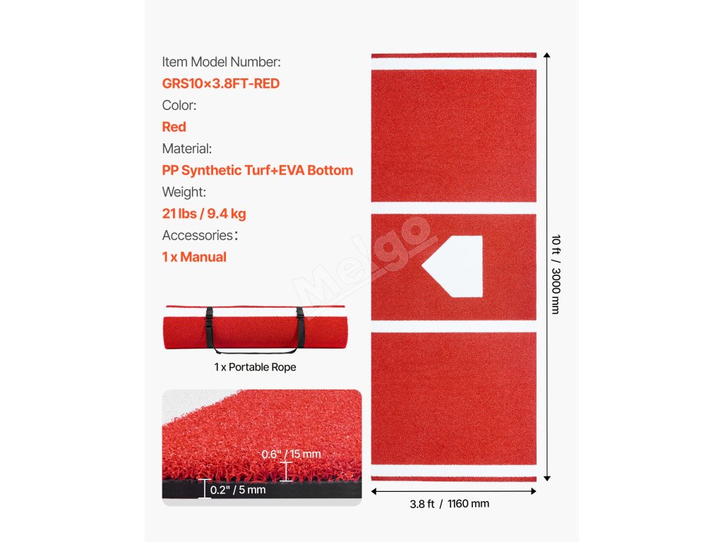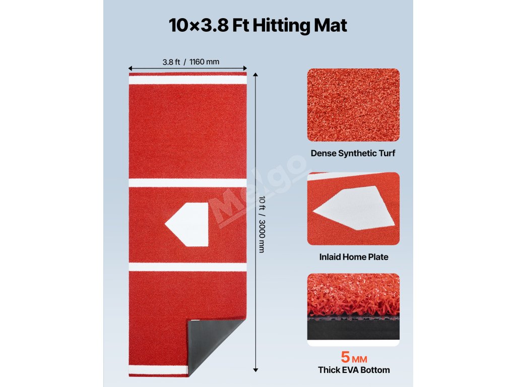 Táto odpaľovacia rohož má 5 mm podklad z materiálu EVA, ktorý zvyšuje trenie, zabraňuje pošmyknutiu a chráni podlahu pred poškriabaním a poškodením. Je vhodná na tréning rýchlych aj pomalých odpalov a slúži ako užitočná pomôcka na tréning baseballu.