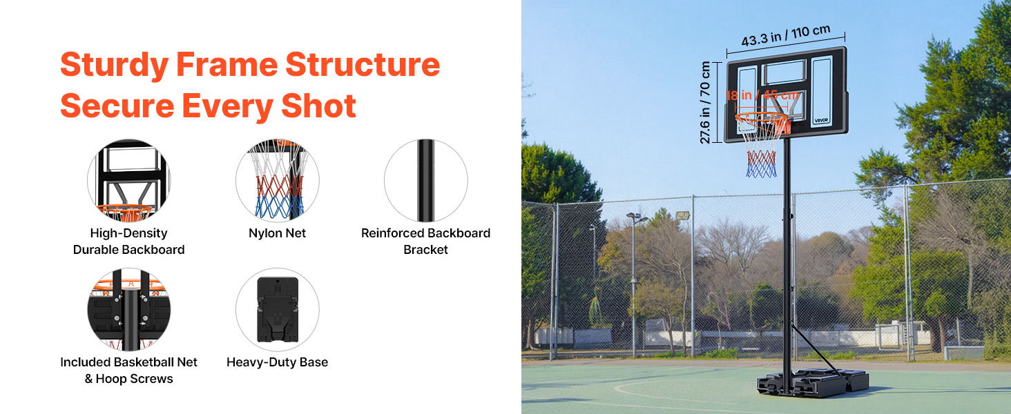 Táto nastaviteľná basketbalová obruč má hrubú zadnú dosku bez vizuálneho skreslenia a so zvýšeným odrazom. Vydrží silné smeče bez prasknutia a dážď nevytvára vodné fólie, ktoré by zakrývali výhľad. Sieťka zo zmesi nylonu je odolná proti roztrhnutiu a zachováva si pružnosť aj po vystavení slnku.