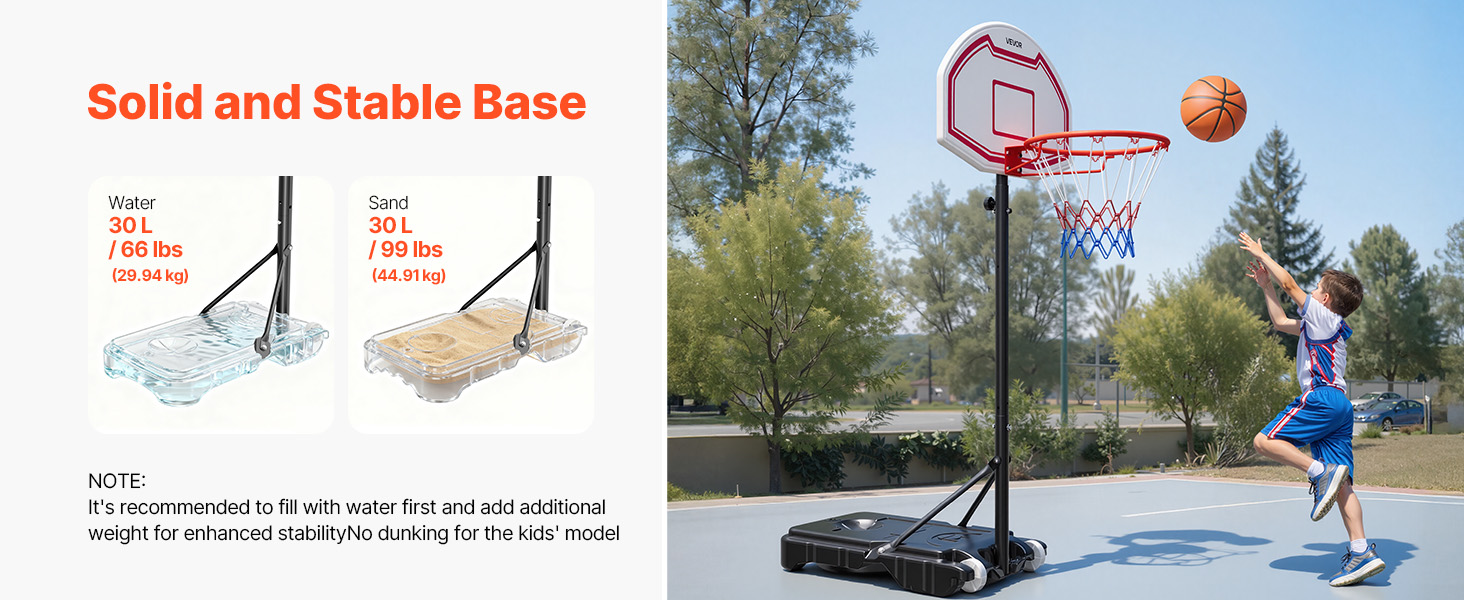Tento nastaviteľný vonkajší basketbalový kôš sa dodáva s hrubým, robustným podstavcom. Základňu môžete naplniť vodou alebo pieskom, čím vytvoríte pevný základ pre každú hru. Je navrhnutá tak, aby podporovala dynamickú hru a zvyšovala stabilitu, udržiava obruč stabilnú počas skokov, striel a cvičení.
