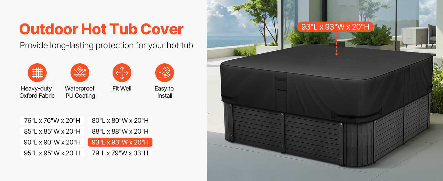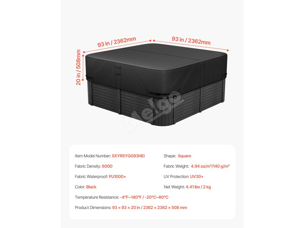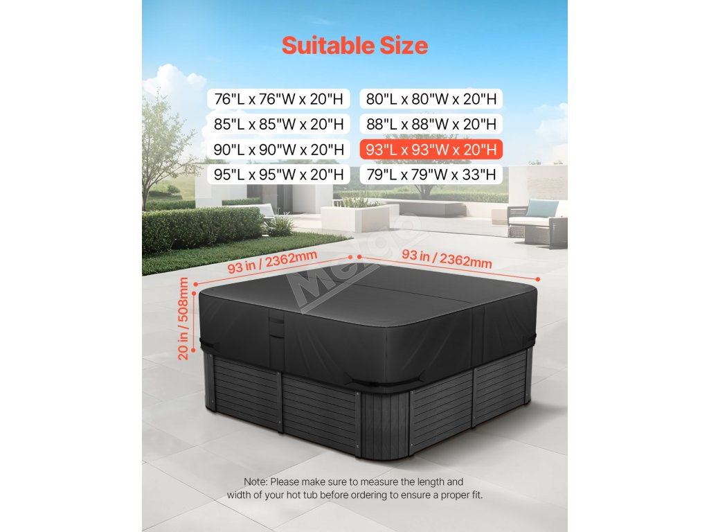 Náš kryt na vírivku s rozmermi 93 "D x 93 "Š x 20 "V (2362 x 2362 x 508 mm) je určený na vonkajšie použitie. Upozornenie: Pred objednaním si nezabudnite zmerať dĺžku a šírku vašej vírivky, aby ste sa uistili, že vám správne padne.