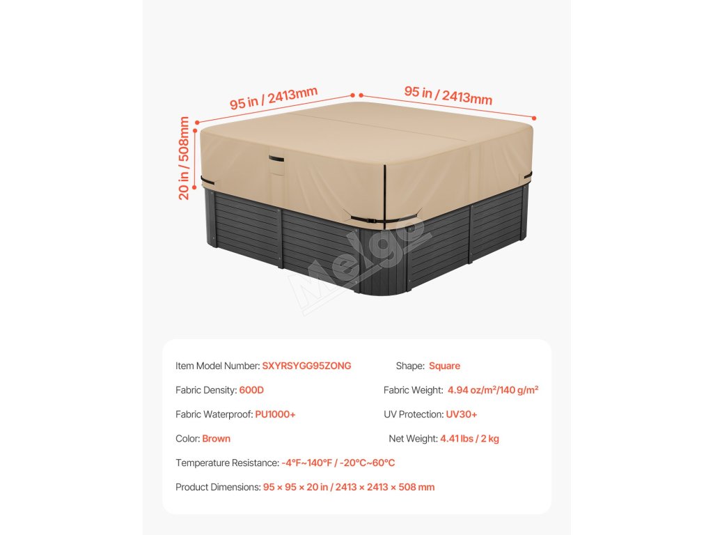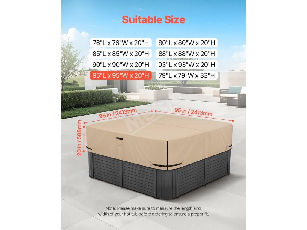 Náš kryt na vírivku s rozmermi 95 "D x 95 "Š x 20 "V (2413 x 2413 x 508 mm) je určený na vonkajšie použitie. Upozornenie: Pred objednaním si nezabudnite zmerať dĺžku a šírku vašej vírivky, aby ste sa uistili, že vám správne padne.