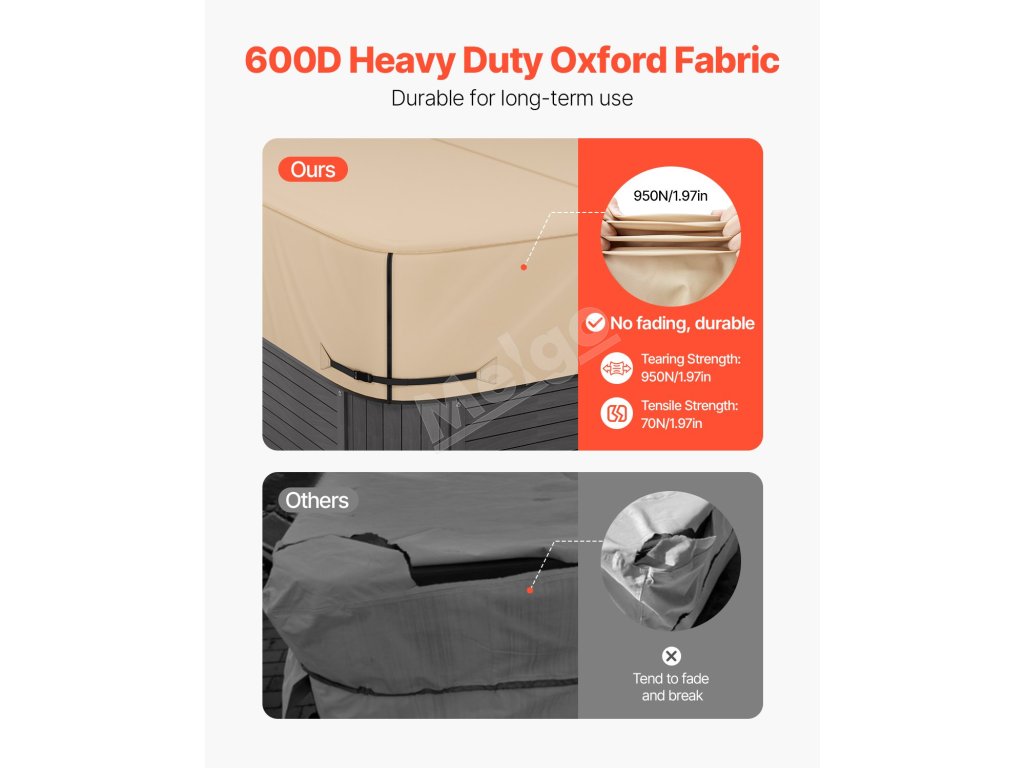 Tento vonkajší poťah na vírivku je vyrobený zo zhrubnutej tkaniny Oxford 600D s pevnosťou proti roztrhnutiu 950 N/1,97 palca. Môže sa pochváliť výhodami, ako je odolnosť proti opotrebovaniu, odolnosť proti roztrhnutiu, proti starnutiu a proti deformácii.