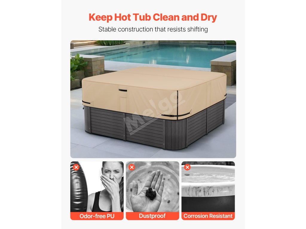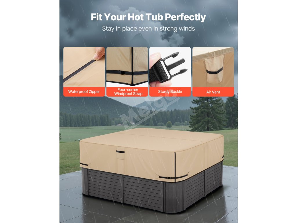 Vďaka viacerým výstužným detailom chránič krytu vírivky dokonale sedí na vírivke. Vetrací otvor pomáha predchádzať vydutiu a každý roh je vybavený nastaviteľnou prackou, vodotesným zipsom a pevným popruhom, čo zaručuje, že zostane pevne na mieste aj pri silnom vetre.