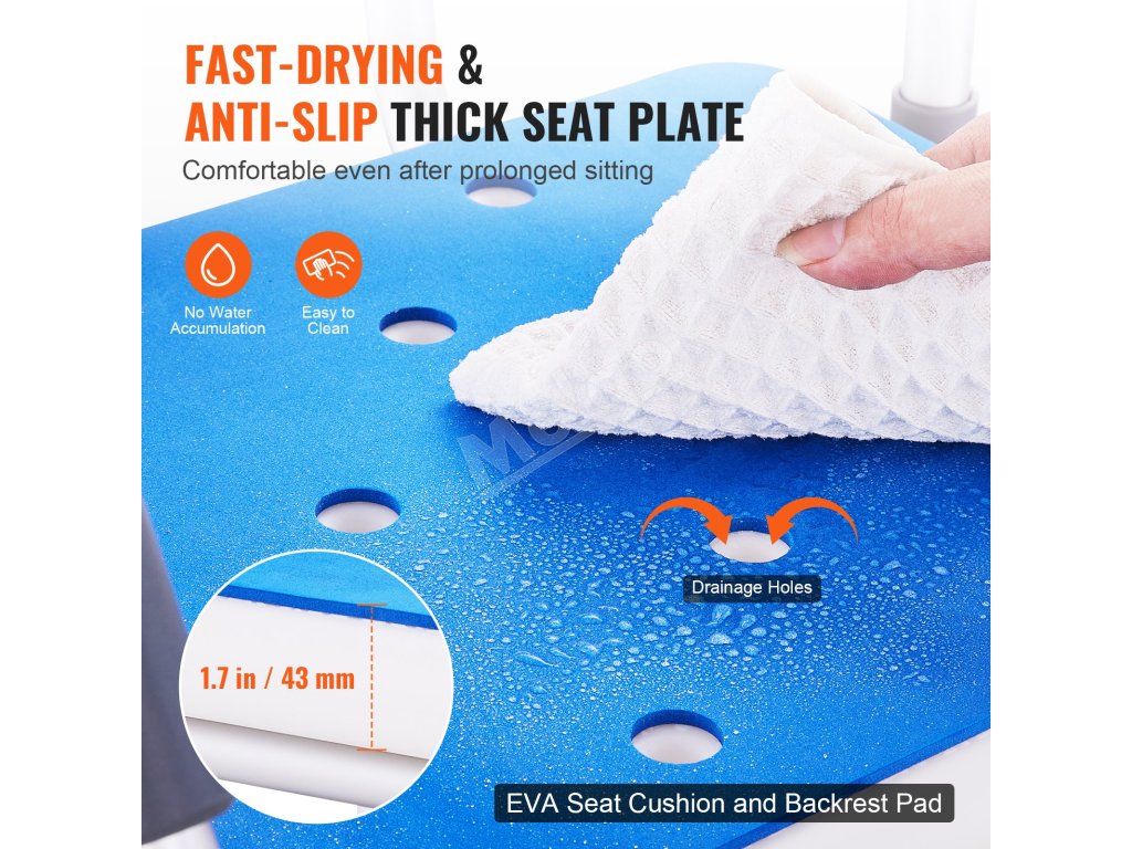 Pohodlne sa usaďte na predĺžené mäkké sedadlo z HDPE plastu s hrúbkou 1,7 palca, ktoré je navrhnuté pre dlhotrvajúce pohodlie. Vďaka viacerým odtokovým otvorom rýchlo schne a zostáva hygienické. Čistenie je bezproblémové - stačí ho po každom použití utrieť, aby ste ho mohli bezproblémovo udržiavať.
