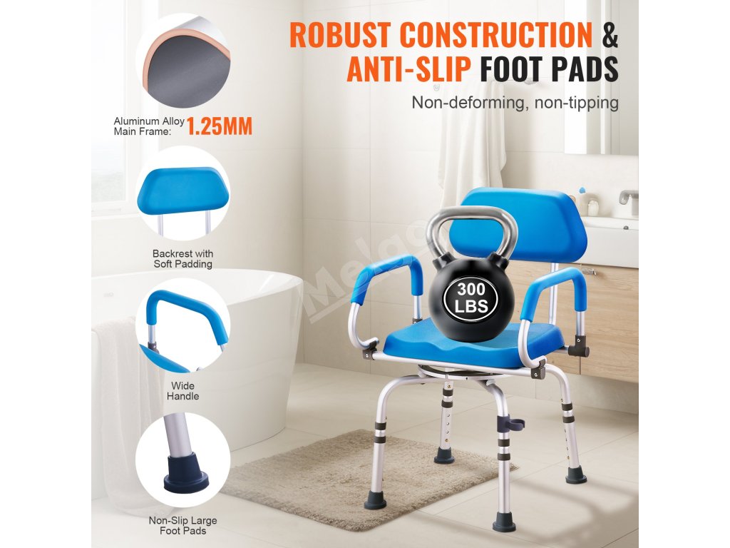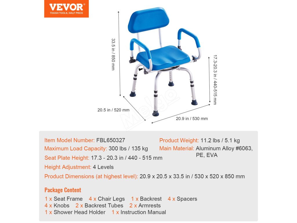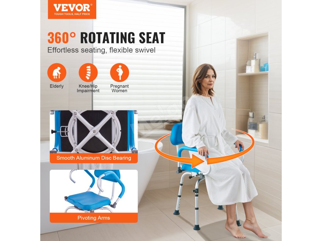 Sprchujte sa bezpečnejšie a pohodlnejšie s 360° otočnou stoličkou VEVOR. Toto sprchovacie sedadlo, ktoré je ideálne pre seniorov, zdravotne postihnuté osoby a tehotné ženy, má 360° otočné sedadlo, mäkké polstrované sedadlo, otočné opierky rúk a 4-stupňové nastavenie výšky pre maximálne pohodlie.