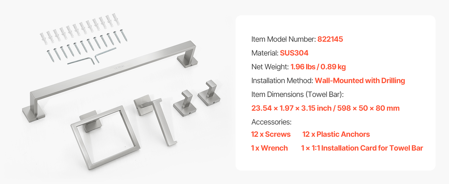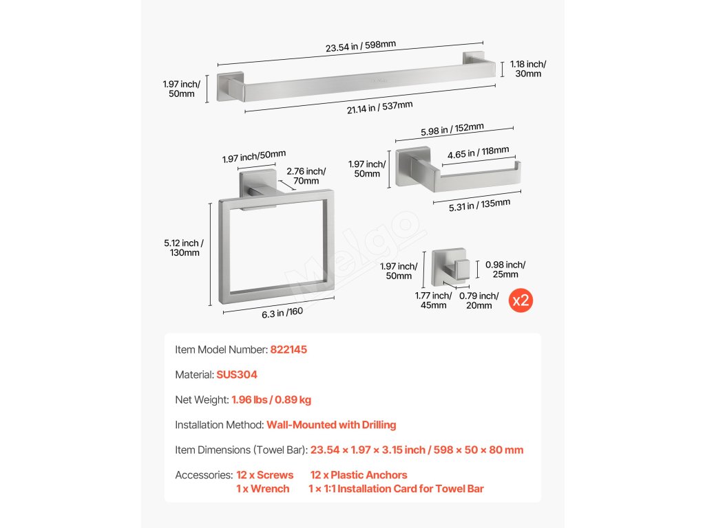 | Rozmery držiaka na uteráky | 23.54 x 1,97 x 3,15 palca / 598 x 50 x 80 mm |