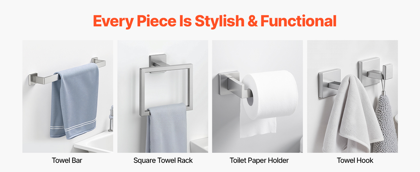 Vďaka klasickému minimalistickému dizajnu sa táto súprava držiakov na uteráky bez problémov kombinuje s rôznymi kúpeľňovými dekormi a prináša nadčasovú eleganciu.