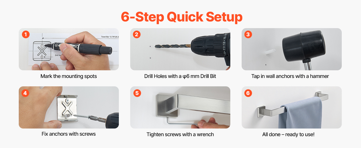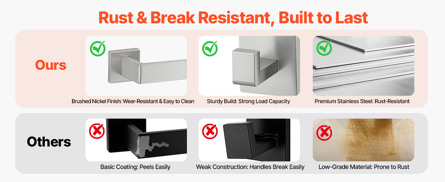 Naša súprava držiakov na uteráky je vyrobená z vysokokvalitnej nehrdzavejúcej ocele, ktorá je odolná proti opotrebovaniu, poškriabaniu a hrdzi - ideálna do vlhkého prostredia kúpeľne a vyrobená na dlhú životnosť.