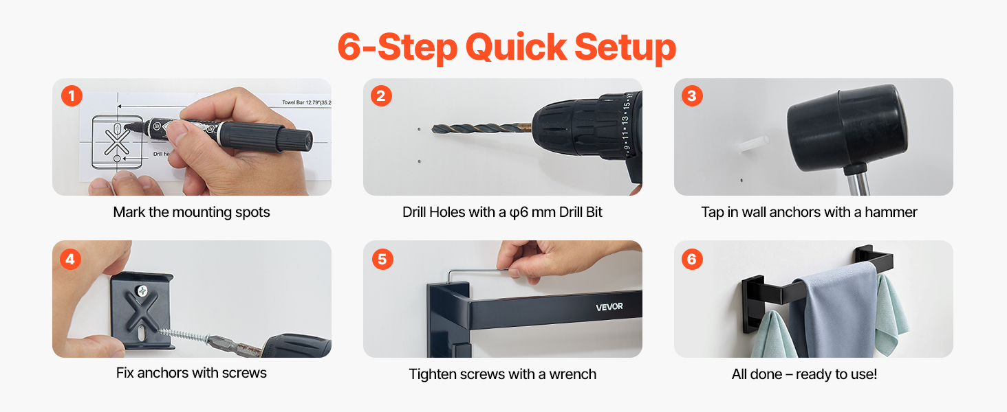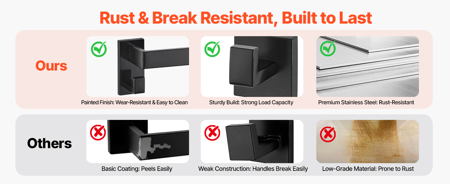 Naša súprava držiakov na uteráky je vyrobená z vysokokvalitnej nehrdzavejúcej ocele, ktorá je odolná proti opotrebovaniu, poškriabaniu a hrdzi - ideálna do vlhkého prostredia kúpeľne a vyrobená na dlhú životnosť.