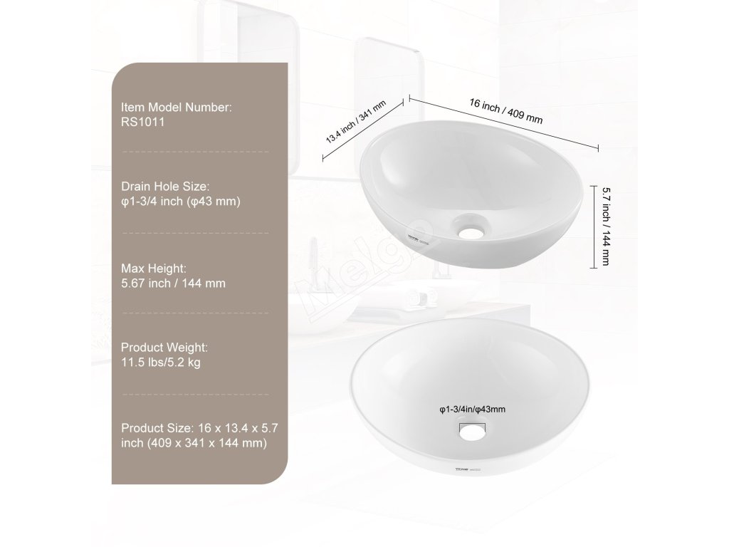 Oválne keramické nadpultové umývadlo 16"×13.4", biele do kúpeľne
