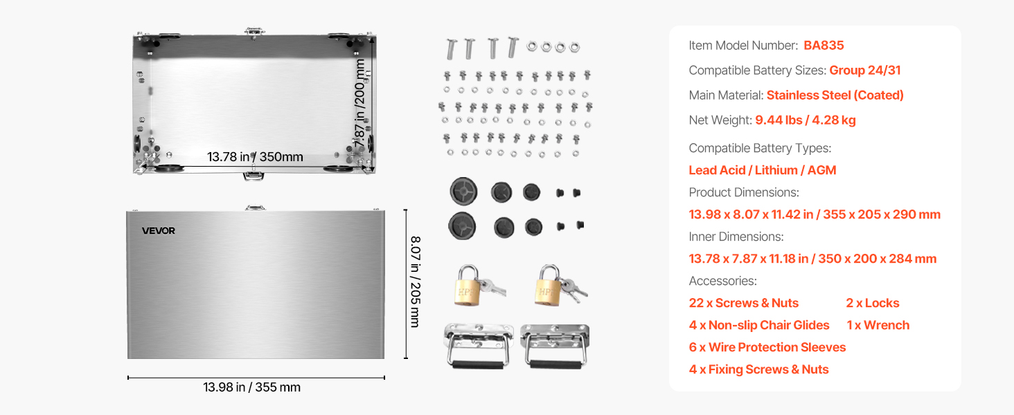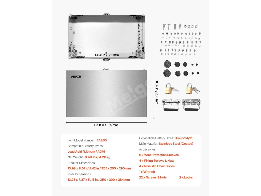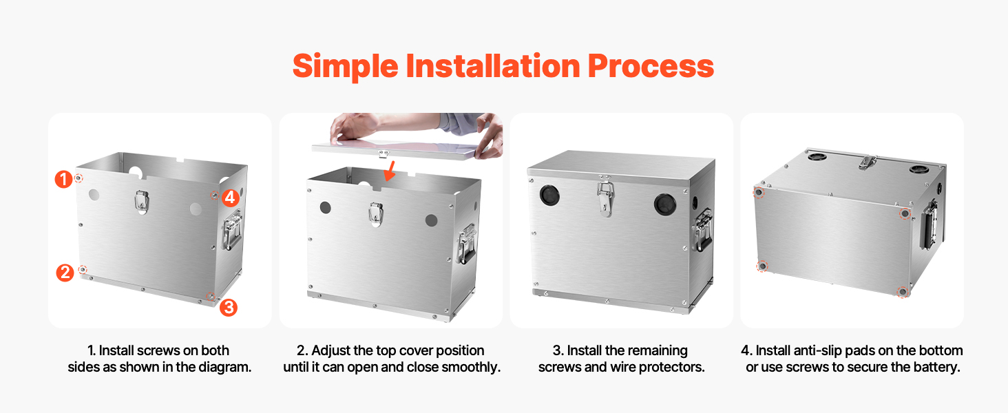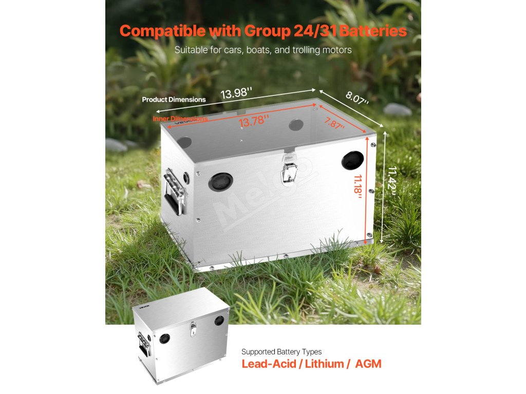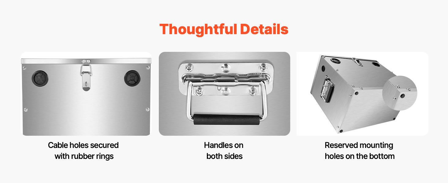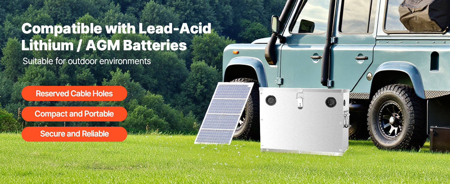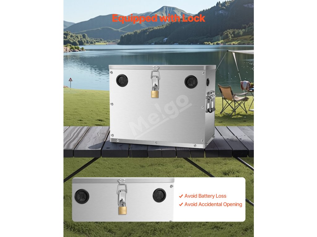 Tento box na batérie podporuje 12V/24V/36V olovené, lítiové a AGM batérie. Je vyrobený z nehrdzavejúcej ocele 201 a je odolný voči nárazom, teplu a náročným podmienkam. Je vybavený viacsmerovou kabelážou, zámkom na zabezpečenie a dizajnom s dvoma rukoväťami na prenášanie.